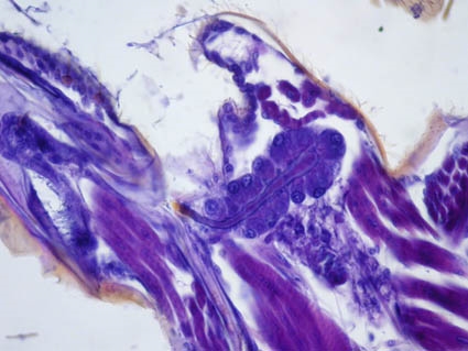 Und hier, zur Lage der Drüse, der misslungen gefärbte Längsschnitt durch das Insekt, der aber immerhin den traubenförmigen Aufbau der Druese  zeigt: