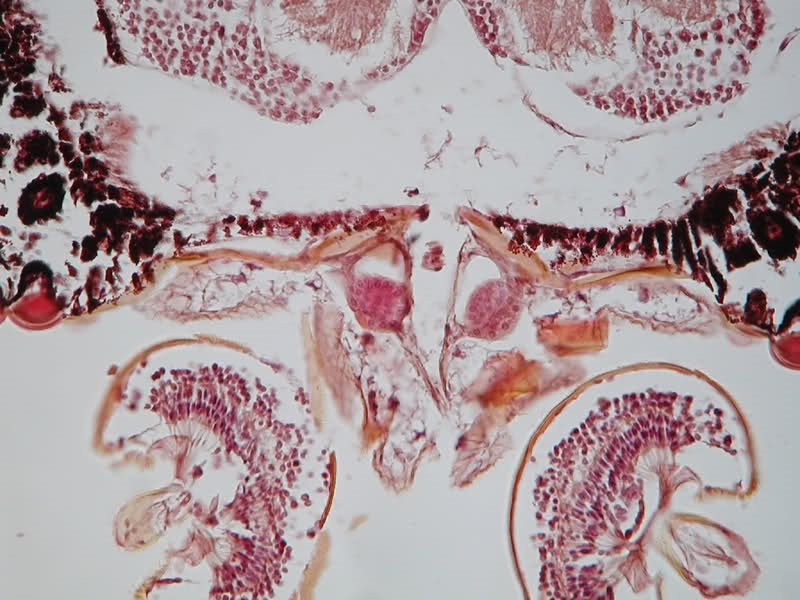 P.S. In meinen Schnittserien finde ich den Ausführungsgang zu den Mundwerkzeugen. Bei meinen Präparaten bin ich mir auch deshalb sicher, dass es sich um eine Drüse handeln muss. Wie sieht es bei Dir aus? Könntest Du auch einmal ein Bild mit etwas stärkerer Vergrößerung schießen?