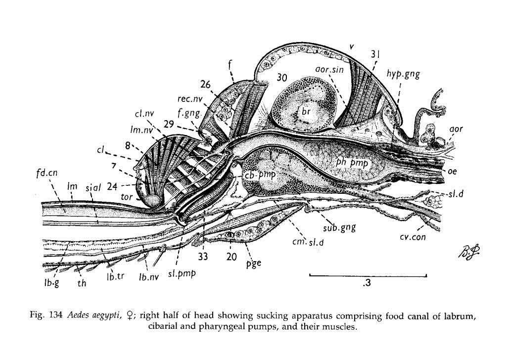 Meine Bemerkung, dass die Speicheldrüsen ja im Thorax lägen, bezog sich auf die Situation der Culex, bzw. diesen von Ralf Feller bereits früher einmal gezeigten Schnitt: