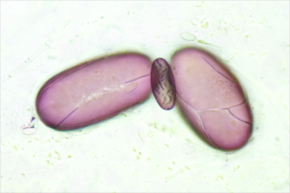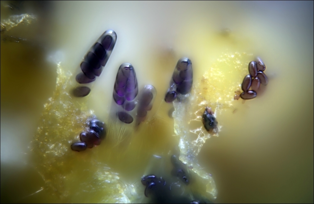 Mikroskopisch, die Aufnahme ist, nun ja, nicht wirklich gelungen, zeigen die Sporen ein typisches Ornament. Eingeklemmt zwischen Goliath und Goliath eine andere Ascobolus-Art: