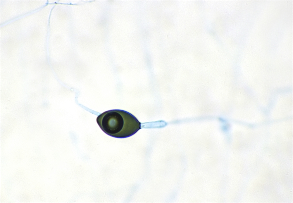 Podospora ist aber auch schwierig, wenn es um die Abbildung geht, hier eine ältere Aufnahme mit ganz wenig Baumwollblau. Und zu viel war's dennoch insofern, als de Bary bubbles entstanden: