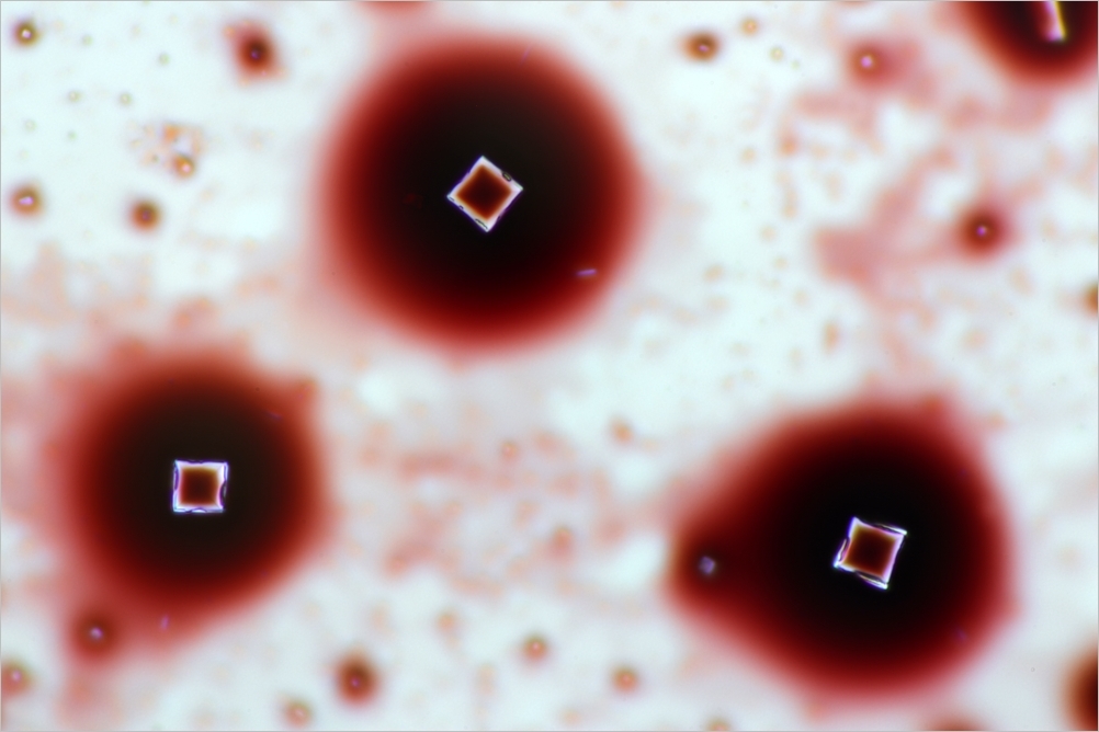die etwas reißerische Aufmachung möge man verzeihen, aber die Kristalle sind klein, verwachsen – und bei solchen Motiven kann ich nicht widerstehen: Eisen(II)-dimethylglyoxim-Pyridin.