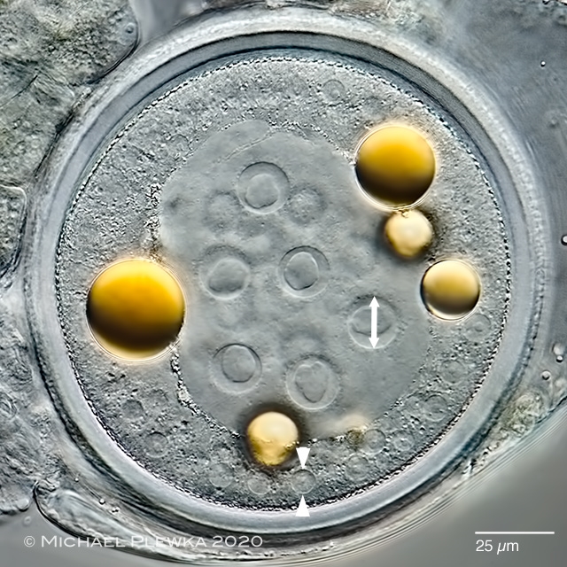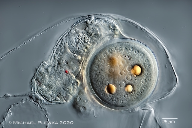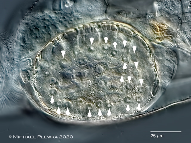 Bemerkenswert ist auch dieses Weibchen: man sieht auf der linken Seite ein Männchen im Uterus (erkennbar an den Spermien), sowie auf der rechten Seite ein Latenzei. Im Latenzei sind Zellkerne sichtbar, wobei  eine Gruppe von  etwas kleineren Kernen auffällig peripher angeordnet ist. Es ist also auch hier wieder zu beobachten, dass das   Latenzei (= Dauerei) der Rädertiere nicht aus einer einzelnen Zelle mit einem Zellkern besteht, sondern  bereits ein Embryo gebildet wird. Im Fall von Asplanchna priodonta, von der auch dieses Ei stammt, ist die Ruhepause, die diese Latenzeier überdauern können, bevor der Embryo schlüpft, mit bis zu 16 !!! Jahren angegeben.
