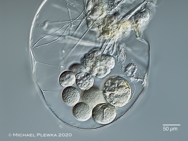 Genauso wie die von Ole dokumentierte Art Rhinoglena frontalis ist auch Asplanchna priodonta, die ebenfalls sehr häufig in der Probe zu finden war, lebendgebärend. Man findet im Uterus dieser Art deshalb häufig mehrere Eier, die sich in ihren Entwicklungsstadien unterscheiden:
