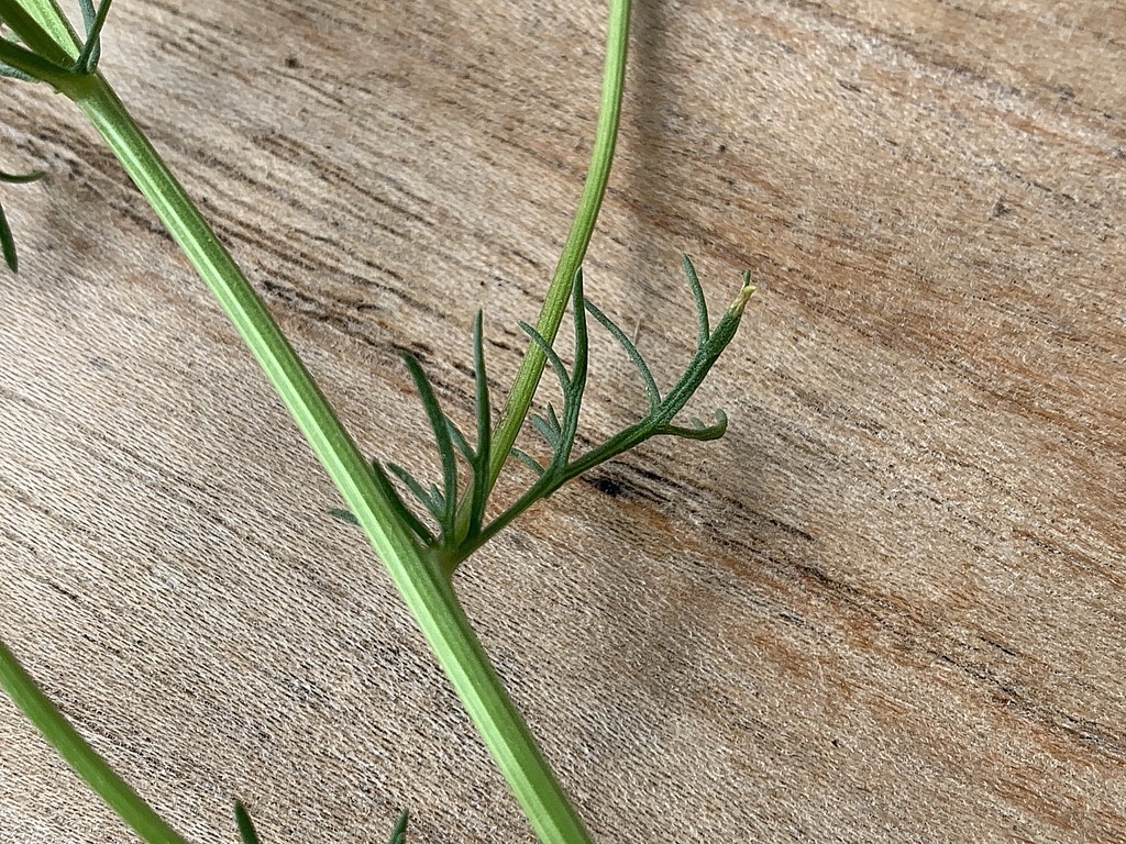 Die Laubblätter sind 4 bis 7 cm lang und zwei- bis dreifach fiederteilig. Die einzelnen Zipfel sind schmal linealisch, knapp 0,5 mm breit, und tragen eine Stachelspitze.