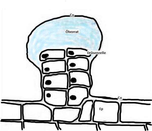 Eigentlich handelt es sich aber nicht um einzelne Zellen, sondern um einen Sekretationsapparat aus bis zu acht Zellen in regelmäßiger Anordnung (Drüsenschuppe)  mit einer Aufbewahrungsraum für das gebildete Öl, der aus einer Aufwölbung der Cuticula besteht. Dieser reißt bei mechanischer Belastung ein und gibt das öl frei. Entgegen der Illustration in Bild 15 sitzen die meisten Schuppen allerdings in Reihen an der Wand des Fruchtknotens, also weiter unten als hier eingezeichnet.