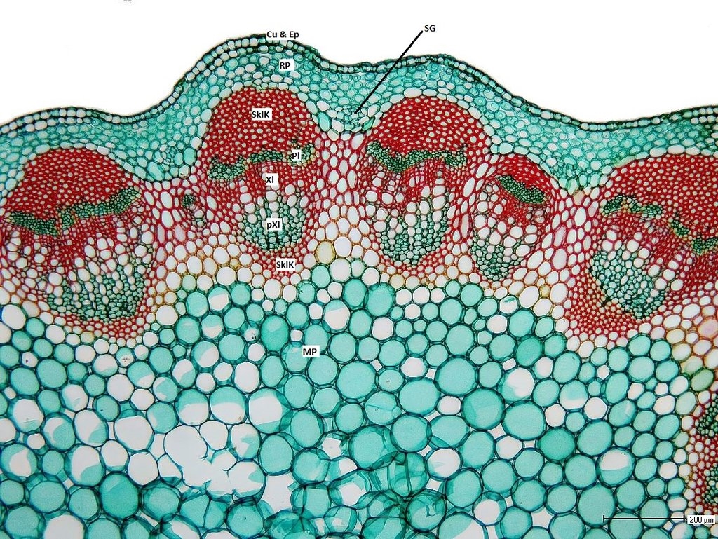 Anhand des beschrifteten Bildes 10c finden wir von außen nach innen: die Epidermis mit einer dünnen Cuticula (Ep und Cu), es folgt das Rindenparenchym (RP), in dem sich zwischen den Sklerenchymkappen der Leitbündel (SklK) einige Sekretgänge mit Drüsenepithel finden (SG). Unter den Sklerenchymkappen dann das oft unregelmäßig ausgebildete Phloem (Pl), ein schmaler Bereich noch nicht ausdifferenzierter Zellen mit dem Cambium (Ca), dann Xylem (Xl) und primäres Xylem (pXl). Innen hinter einer kleineren Sklerenchymkappe dann die Zellen des Markparenchyms (MP)