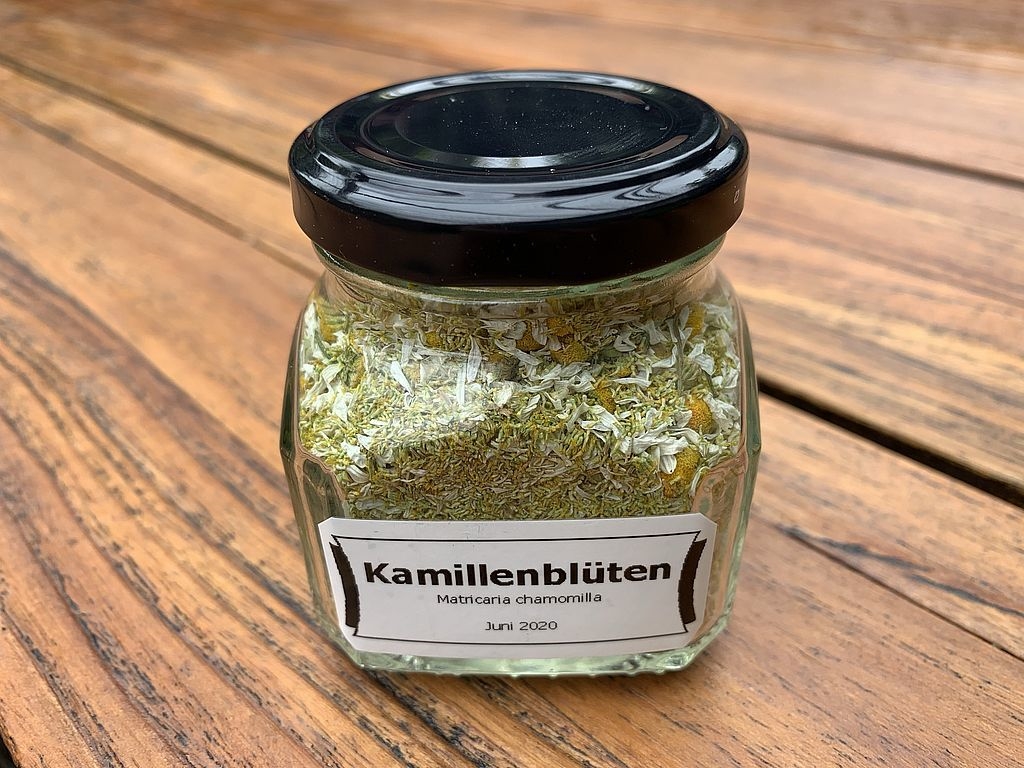 Wie oben geschrieben, haben wir selbst Kamille gesammelt und nur die Blütenstände getrocknet. Hier der Weg von der Pflanze ind Glas:
