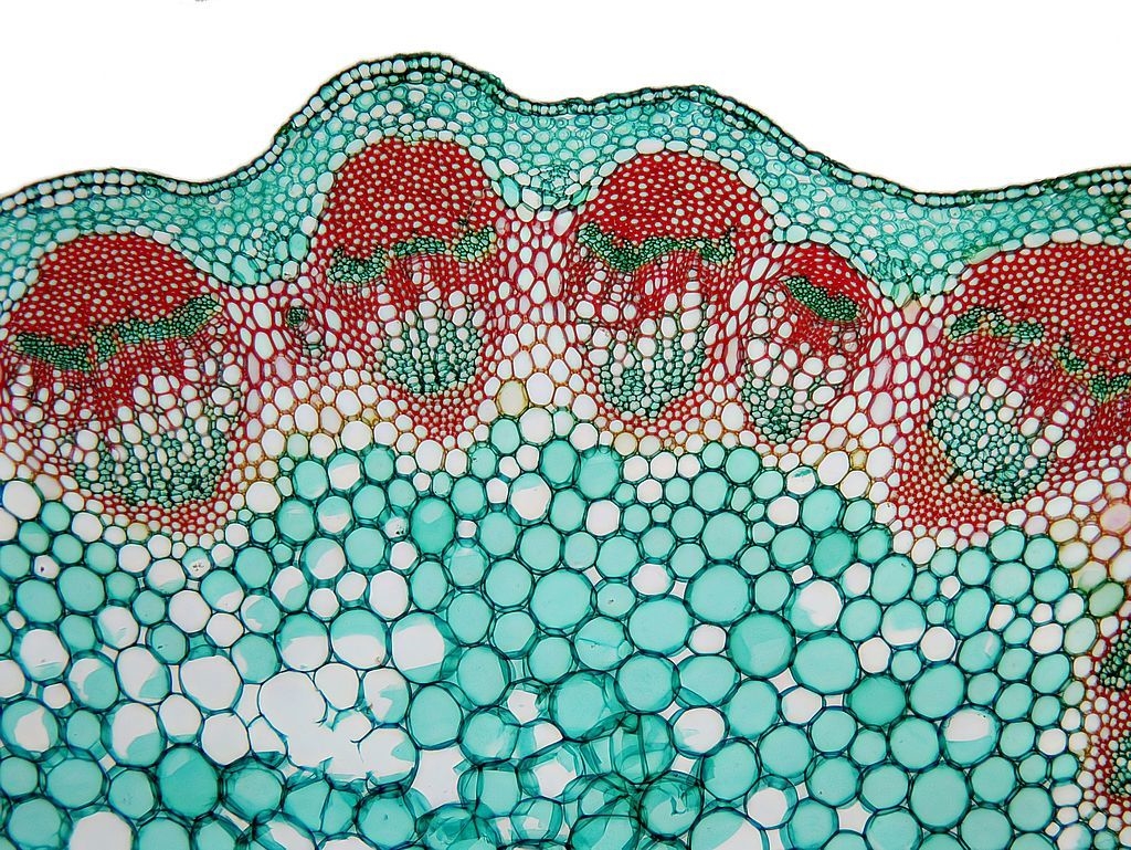 Wie bei einer krautigen Dikotylen zu erwarten, finden wir zunächst keine Überraschungen. Ein Leitbündelring umgibt das Markparenchym, nach außen hin folgen die klassischen Abschlussgewebe.