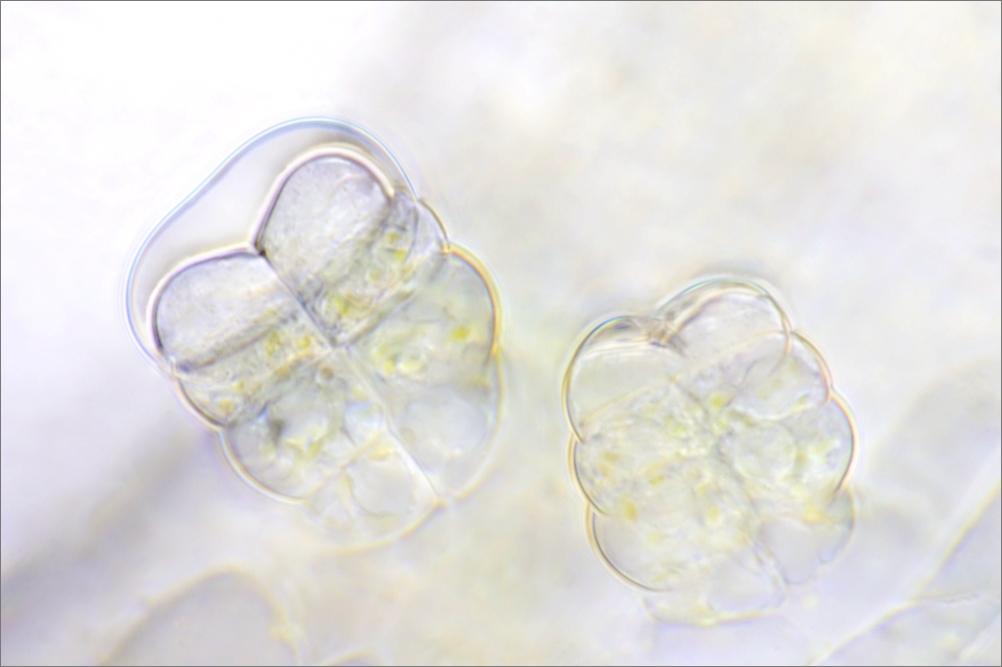 Bild 17: Zwei Drüsenschuppen mit gefüllten Köpfchen von schräg oben aus einem frischen Präparat