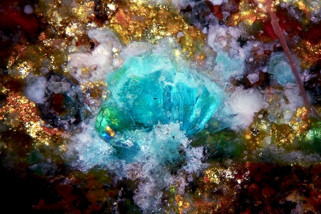 Ich habe einen Epifluoreszenzkondensor für die EpiPol-Beleuchtung neu eingesetzt und brauchte ein schnelles Testobjekt, um das Heimwerkergerät einzustellen. Ich schaute mich in den Schubladen nach einem flachen Objekt um und fand eine hässlich aussehende 1-Cent-Münze. Sie hatte einen grün-bläulichen Fleck, der bei genauerem Hinsehen enthüllte, was ich für Kupfersalzkristalle halte. Hier ist ein Stapel mit einem der Kristalle.