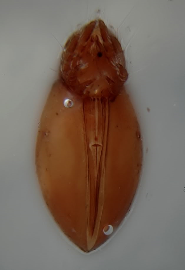 Eine meiner Lieblingsmilben sind die Phthiracaroidea und die Euphthiracaroidea, die alle seitlich flach sind, und sehr eigenartige Genitale- (oben) und Anale-Öffnungen (unten) haben (die twei 'Türe' ventral). Ich könnte dieses Examplar von Buch 'Primitive Oribatids of the Palaearctic Region' bestimmen, es ist Oribotritiidae, Entomotritia piffli.