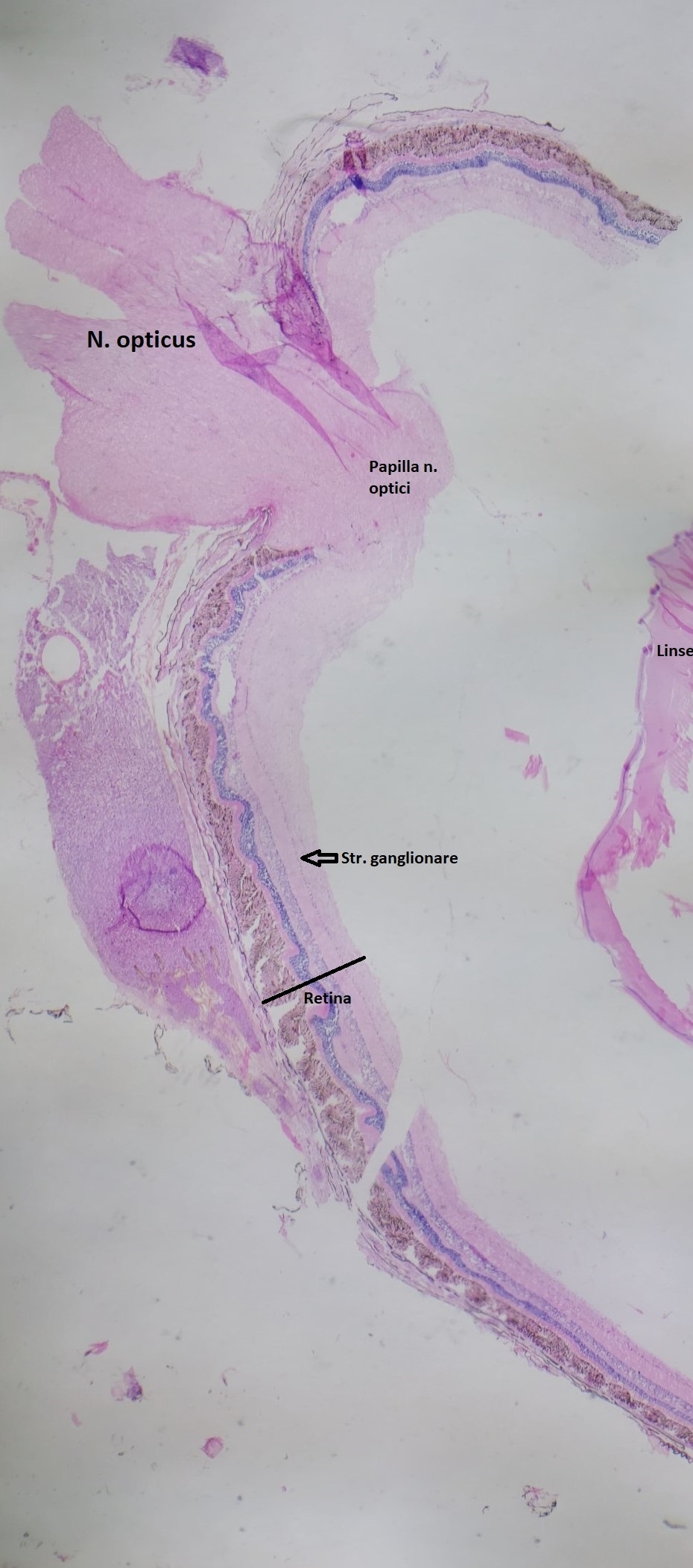 Ich zeige die Histologie des Auges. Bei dem hergestellten Präparat handelt es sich um das Auge eines Fisches, dessen Aufbau allerdings mit dem menschlichem Auge ziemlich ident ist.
