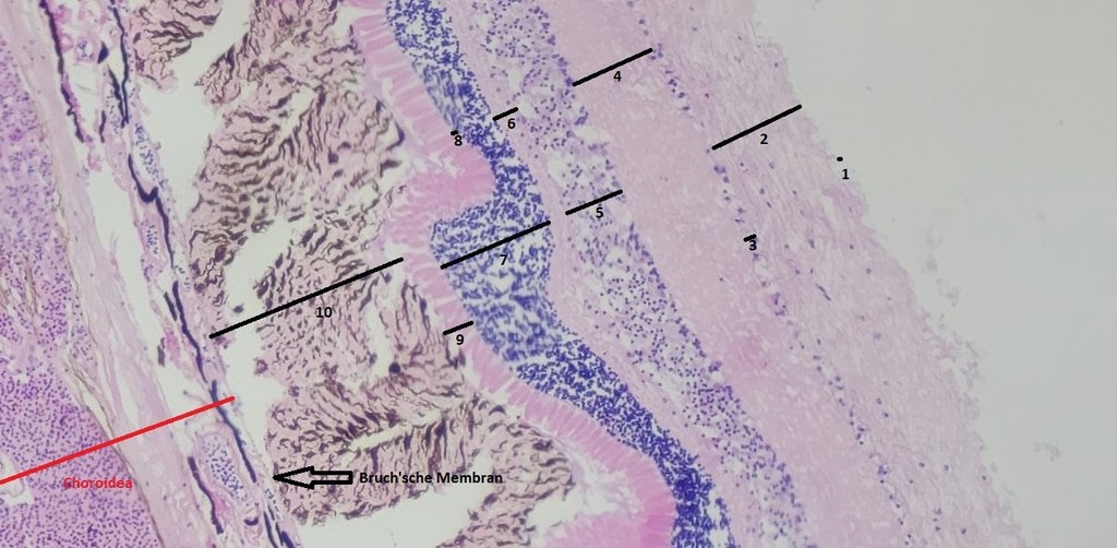 10 = Stratum pigmentosum (Pigmentepithelschicht, das hier eher geschlängelt verläuft)