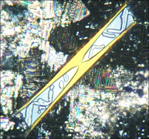 hier habe ich ein paar Bilder von Salicylsäure-Mikrokristallen  im polarisierten Licht. Das erste Bild zeigt Kristalle, entstanden aus der Schmelze. Normal. Aber beim Betrachten der Kristalle, die aus einer Lösung entstanden sind, habe ich Kristalle gefunden, die offenbar Röhrenform haben, mit rechteckigem Querschnitt. Zunächst habe ich gedacht, das sei eine Täuschung, da noch  Wasser um die Kristalle verteilt war. Siehe Bild 2, Pfeile.