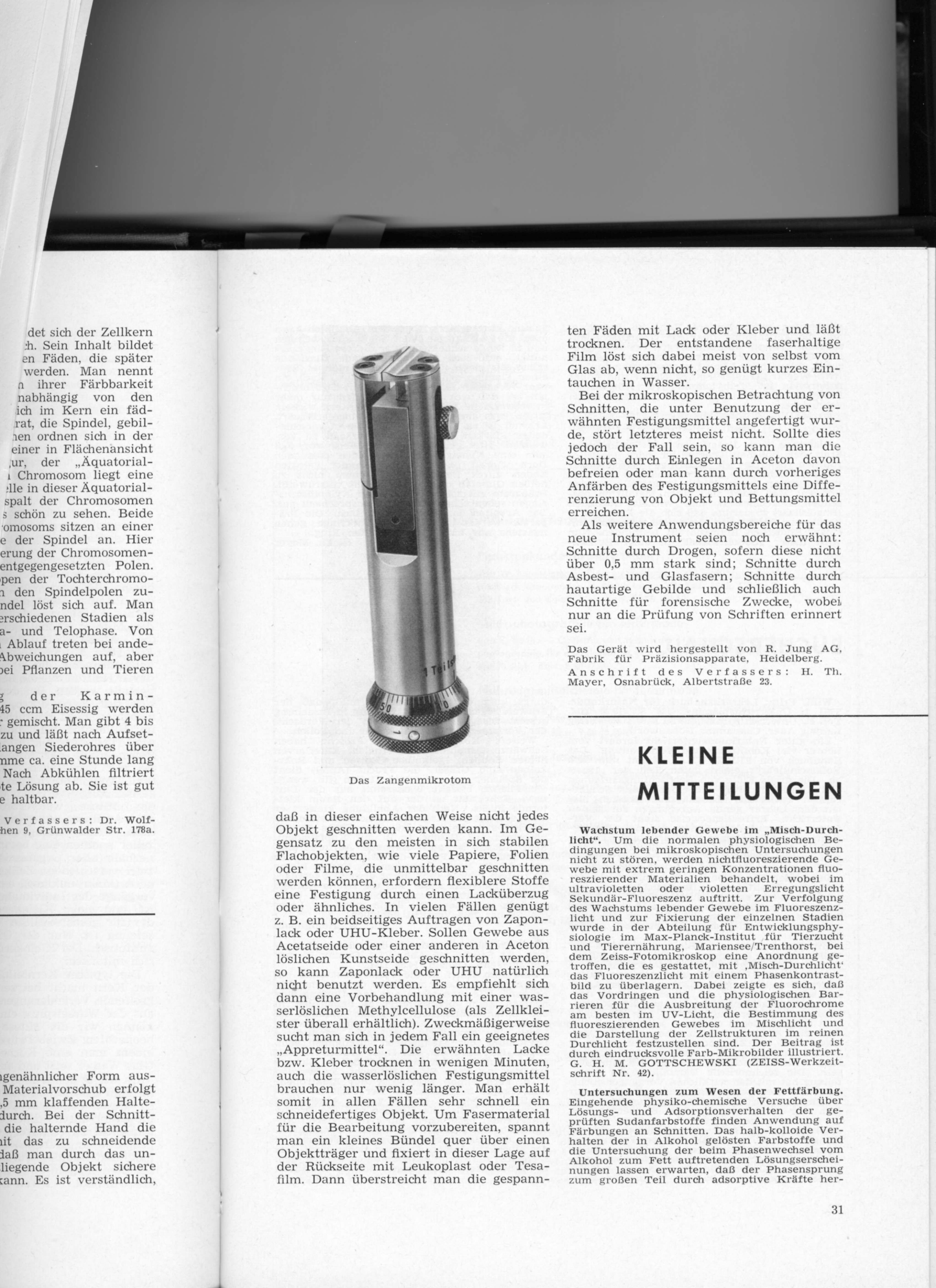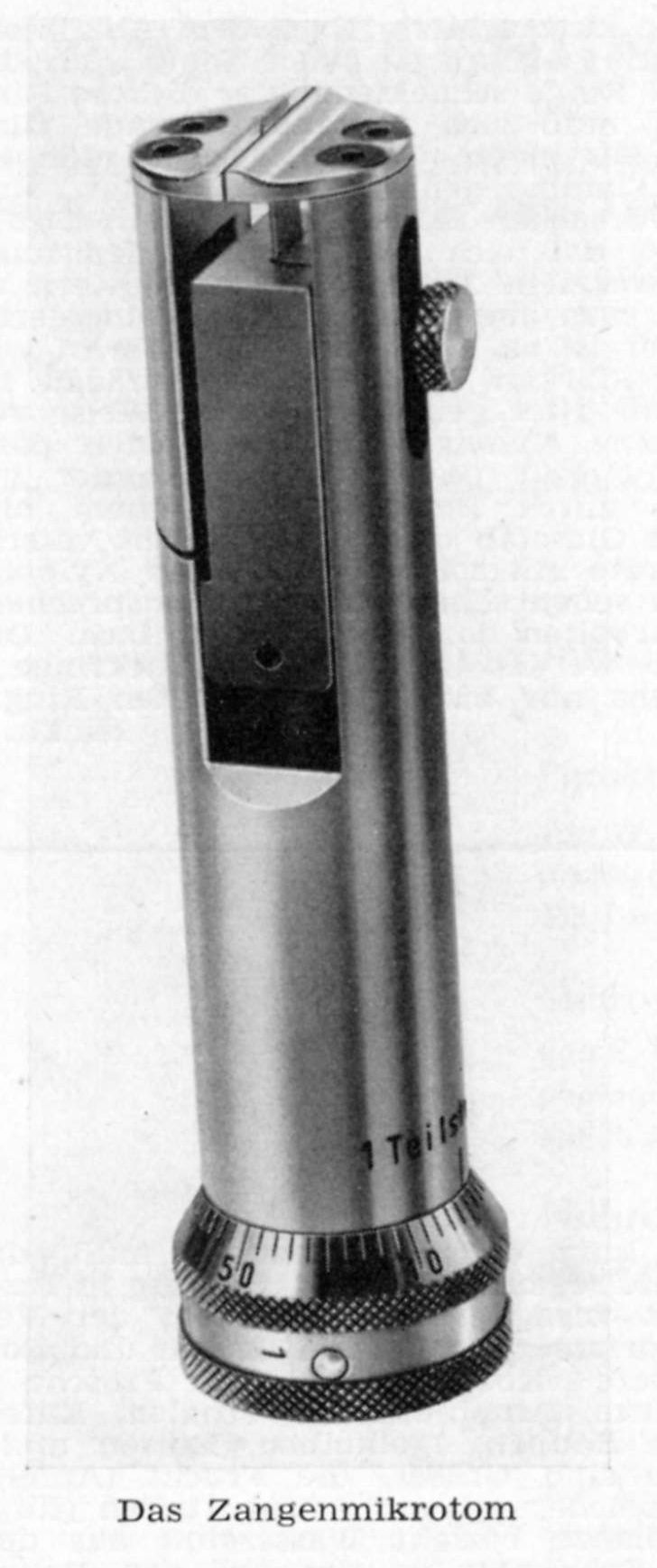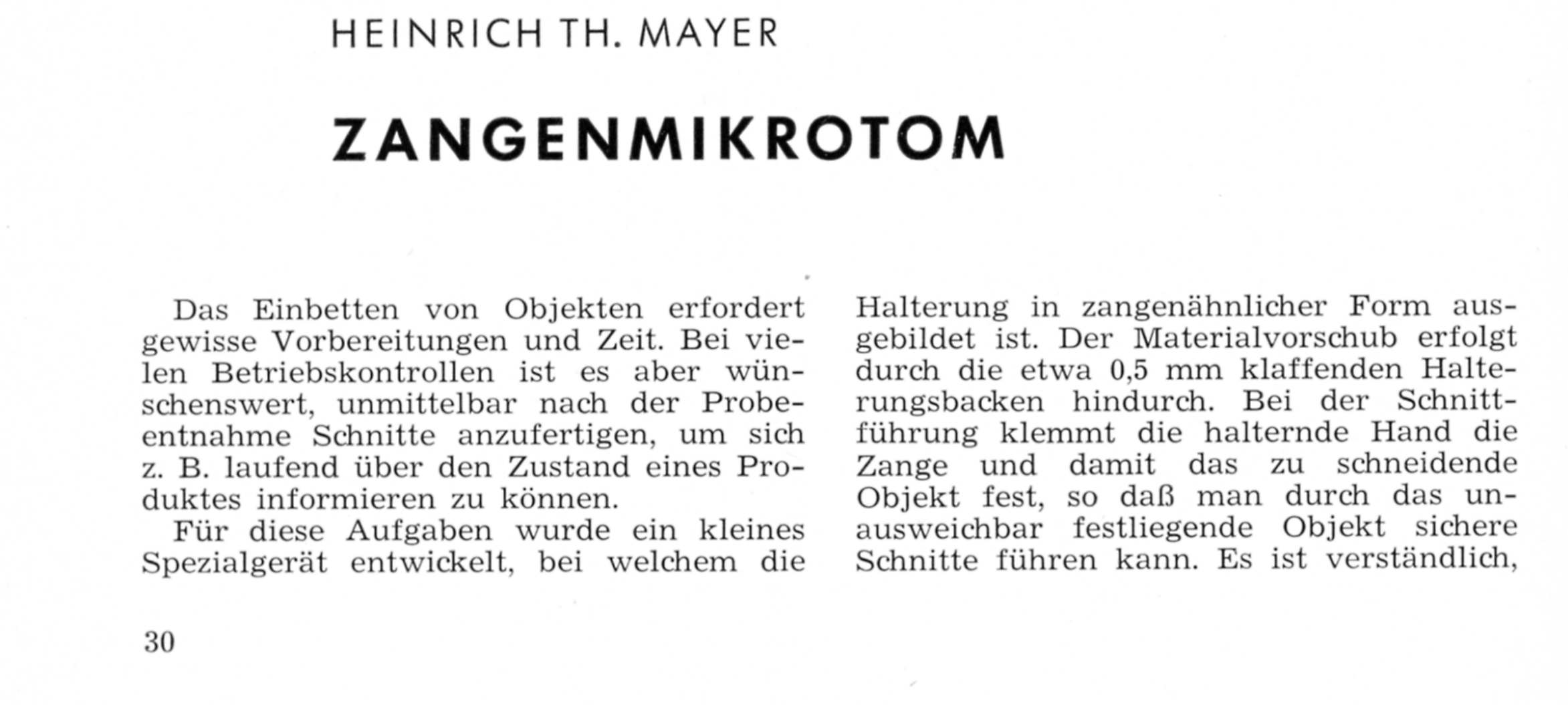 H. Th. Mayer hat im Januar 1962 im Mikrokosmos (Jg. 51, S. 30f) ein Zangenmikrotom beschrieben. Hersteller war R. Jung, Heidelberg (heute Nußloch bei Heidelberg). Für die Beschreibung und die Abbildung füge ich hier folgende Links an: