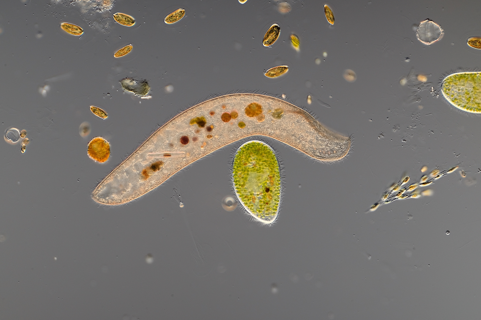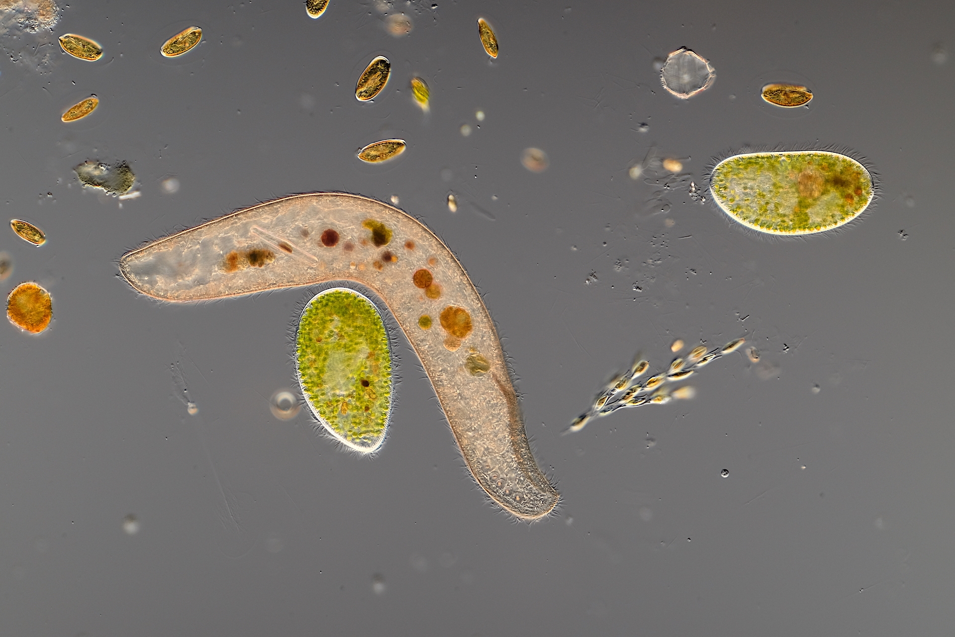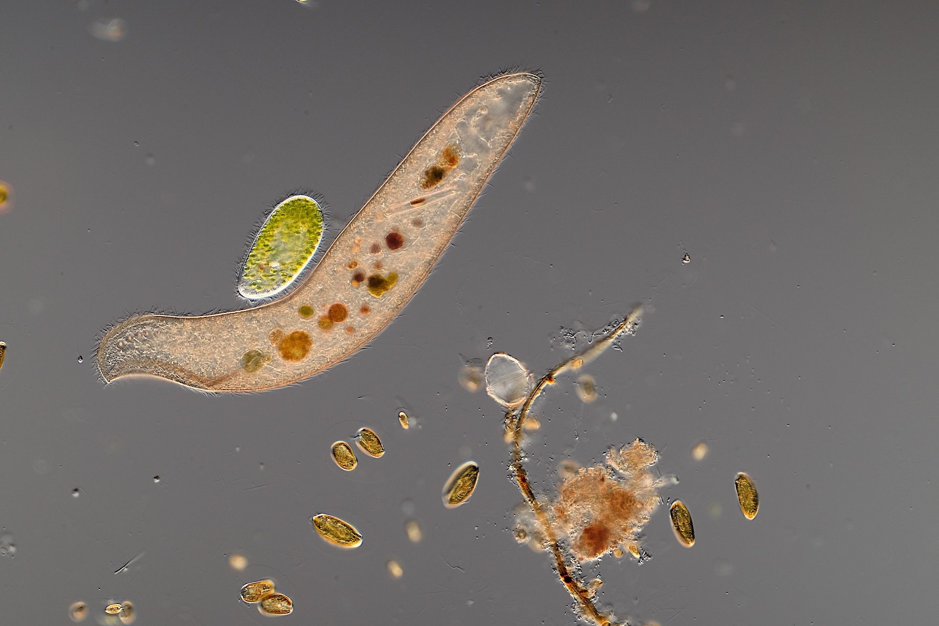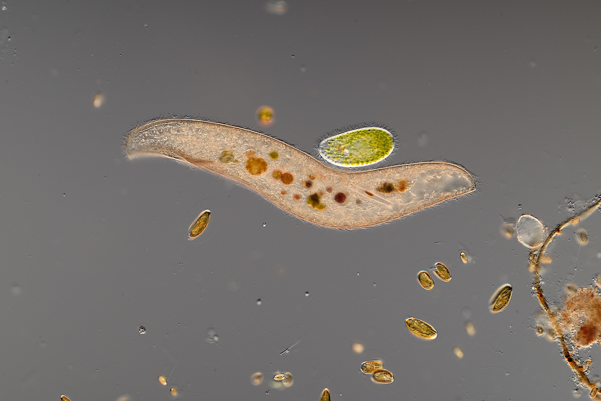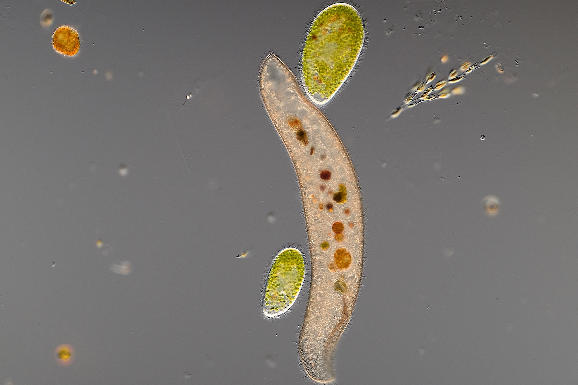 schon sehr oft habe ich in Gewässerproben Wimpertierchen beobachtet, welche sich beim freien Schwimmen zu nahe kamen, sich berührten und sich sofort wieder voneinander entfernten, also ganz normales Verhalten. Nun habe ich jedoch in einer Gewässerprobe ein sehr großes, mir unbekanntes Wimpertierchen (0,6 mm), eine Menge Grüne Pantoffeltierchen (Paramicium bursaria) und noch andere Wimpertierchen, Flagellaten und Algen gefunden. Das große Wimpertierchen und die Grünen Pantoffeltierchen zeigten eine extrem hohe Affinität zu einander. Ein Grünes Pantoffeltierchen umschwärmte, umschmeichelte das große Wimpertierchen ständig und suchte regelrecht Körper.- und Wimpernkontakt zum großen Wimpertierchen. Sie rieben sich aneinander, bürsteten sich mit den Wimpern und konnten nicht voneinander lassen! Es sah fast so aus, als würde das Grüne Pantoffeltierchen auf dem großen Wimpertierchen reiten, es bürsten und massieren, es sah auch aus wie eine Balz....., dass kann doch aber nicht sein!!??  Das Spiel habe ich ca. 10 min. beobachtet, dann wurde die Wasserschicht unter dem DG langsam zu dünn...