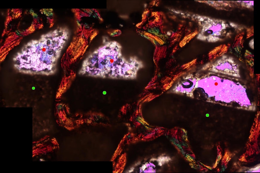 1."Fossile Wasserwaagen", die es erlauben zu zeigen, wie herum der Knochen im Sediment gelegen hat. Mir war beim Schneiden schon aufgefallen, dass eine Seite heller und die andere dunkler wirkte. In der dunkleren waren die Hohlräume der spongieden Konchenmasse mit tonigem Sediment (grün gekennzeichnet) gefüllt, während im Hellenteil diese entweder mit Kalzit oder gar nicht gefüllt sind (rote Punkte).