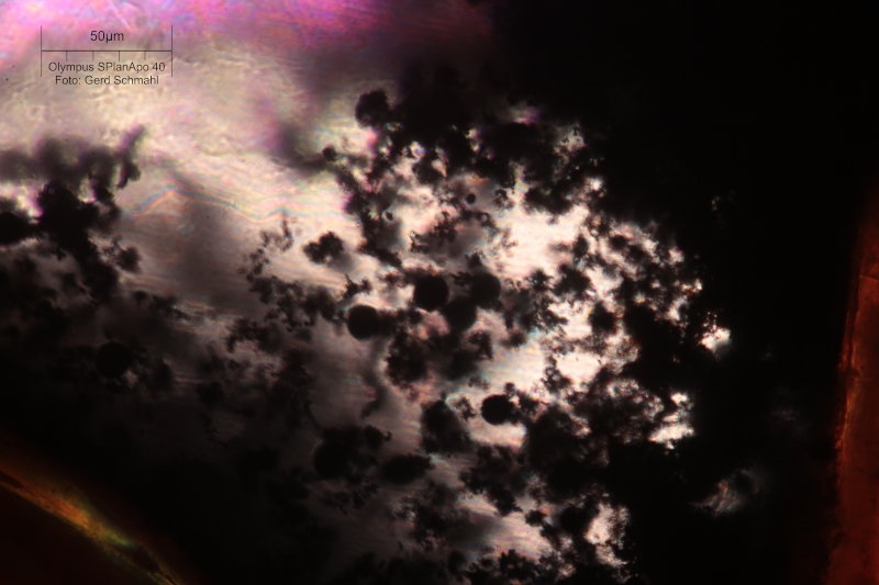 mich hat es nur sehr strutzig gemacht, dass die ?Pyrit-Aggregate alle so ziemlich gleich groß sind, deshalb meine Vermutung, dass es sich um Pilz- oder Bakterienhinweise handeln könnte.