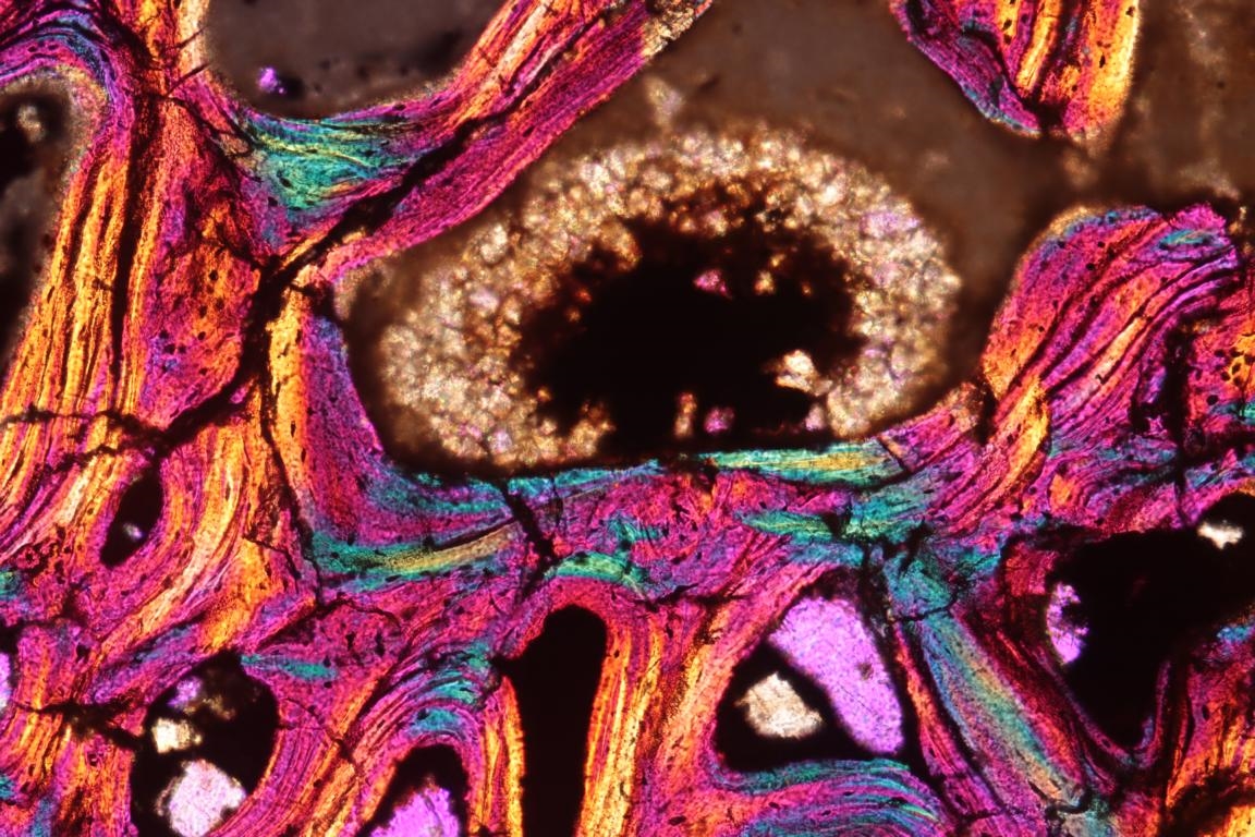 Bild 4:Die innere spongiede Knochenmasse, in deren Zwischenräumen einst das Rote Knochenmark die Roten Blutkörperchen bildete. Hier jetzt mit einer kleinen Kalzitdruse. X-Pol + Rot1