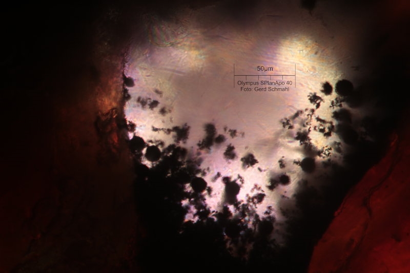 2. fanden sich in manchen Kalzitdrusen undurchsichtige Gebilde, die sehr wahrscheinlich aus Pyrit bestehen. Das ist erstmal nichts Besonderes, aber sie erinnern an Bakterienlager oder Pilzkoniden, wobei die runden Kügelchen fast alle gleich groß sind, was sehr für die Pilze spricht und nicht für spontane Pyritisierungen. Hier 2 Bilder: