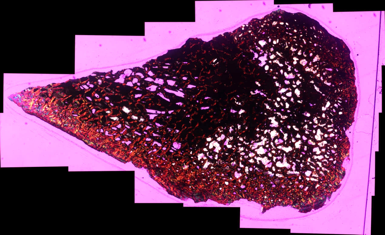 Bild 2: Ein Panorama des Dünnschliffes zum Überblick, Aufnahme in X-Pol mit Rot1