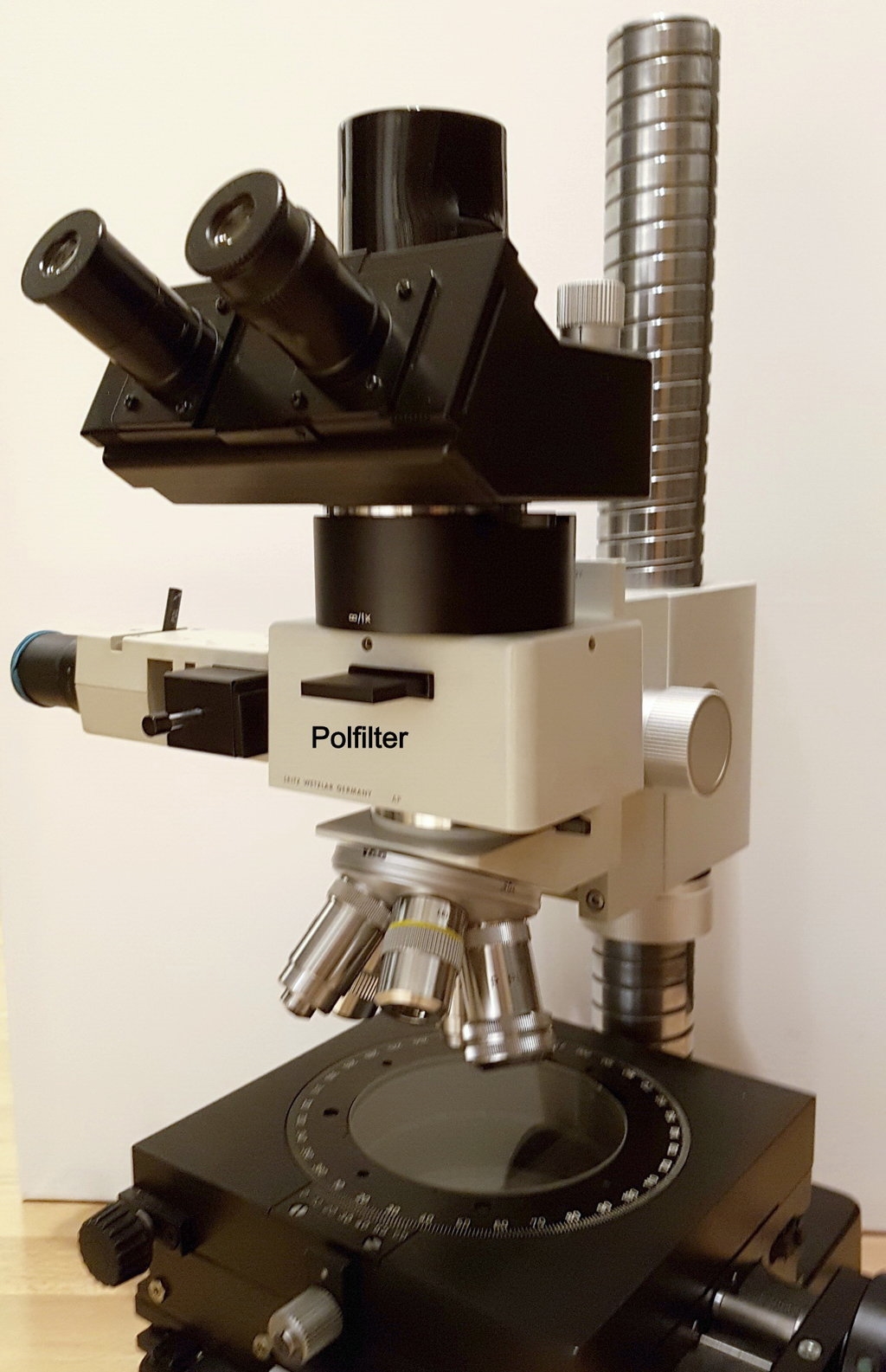 Das Polfilter (Analysator) ragt hinten (Bild 3)  heraus, dafür die Aussparung.