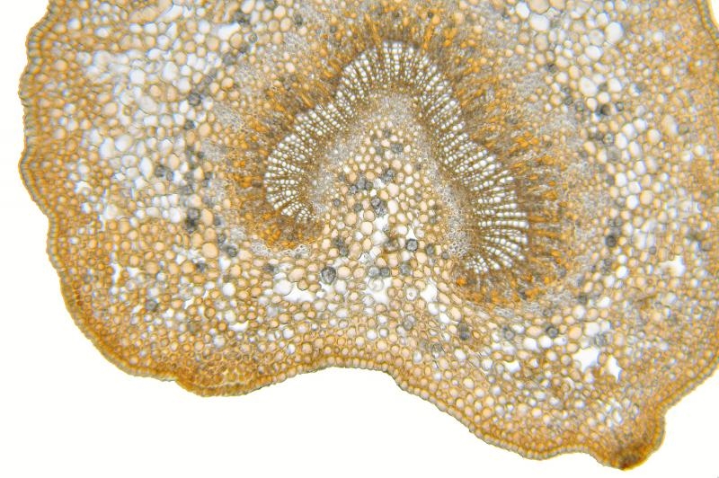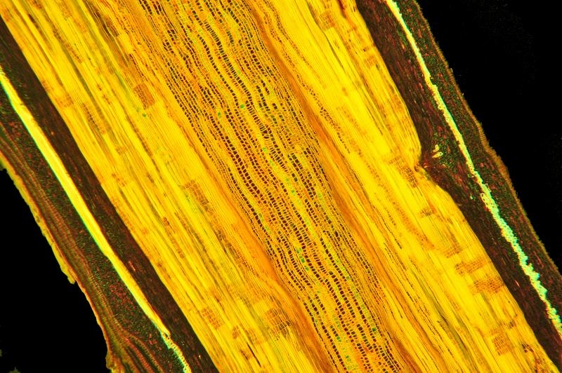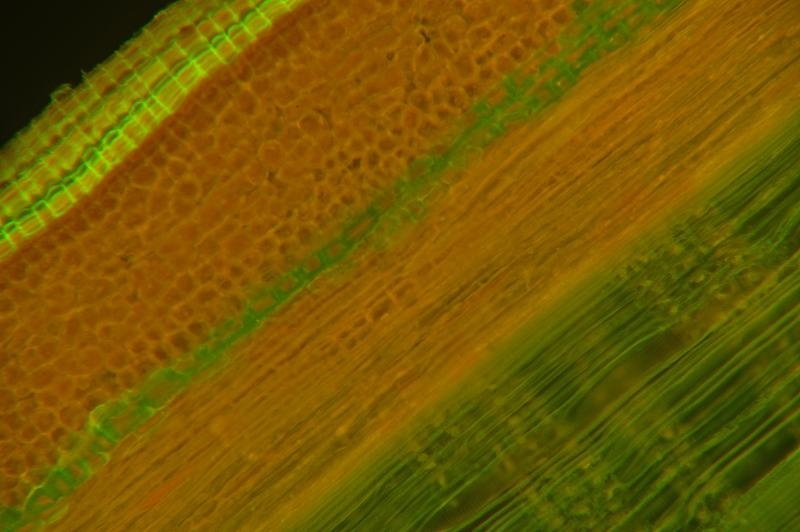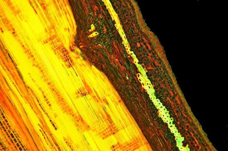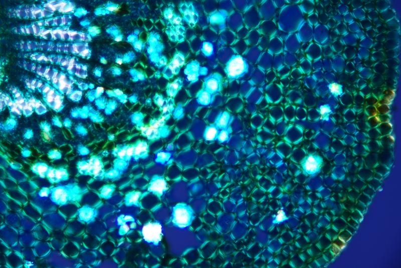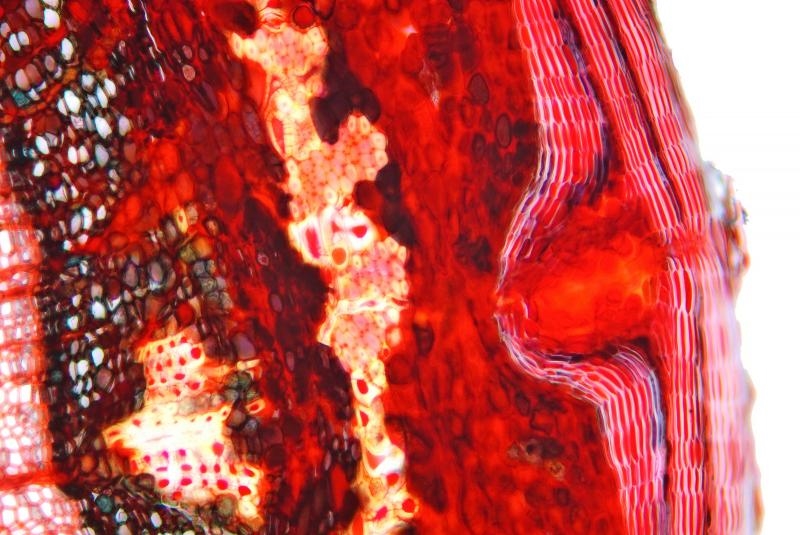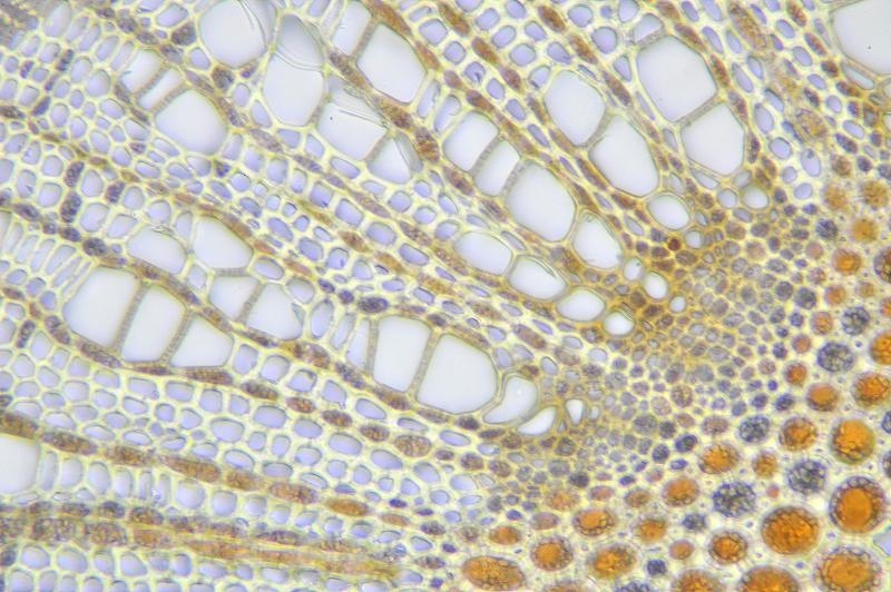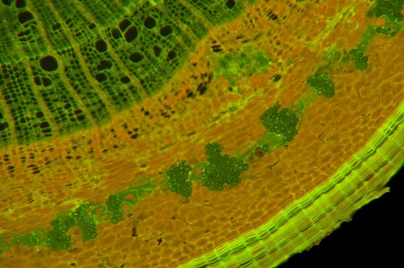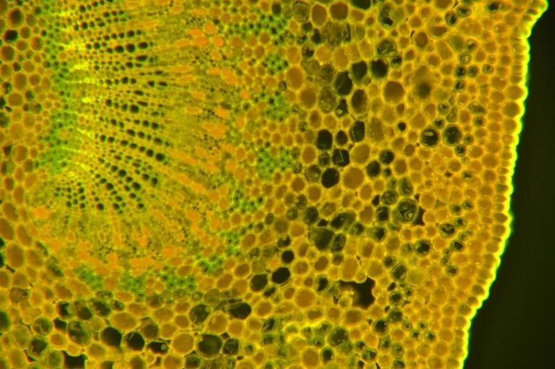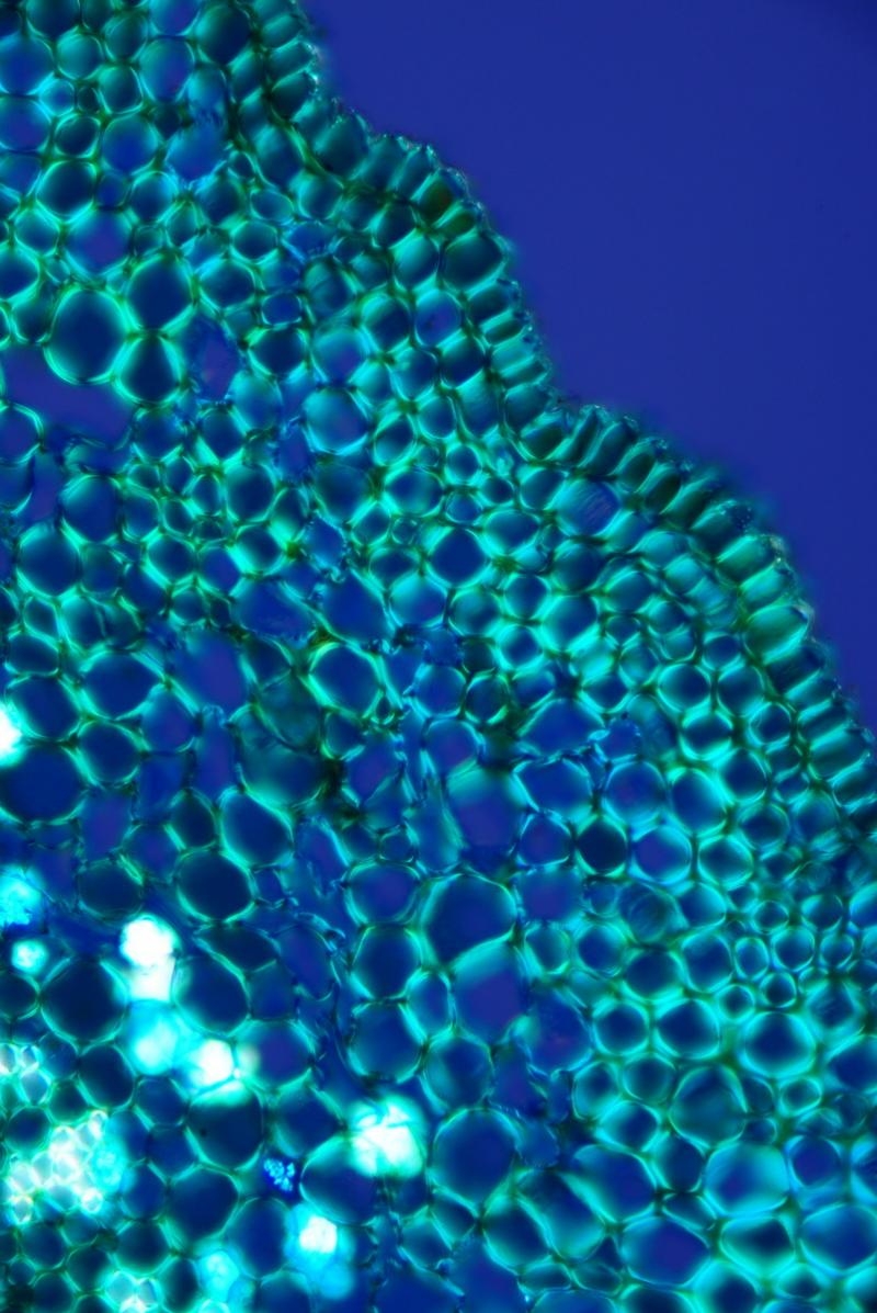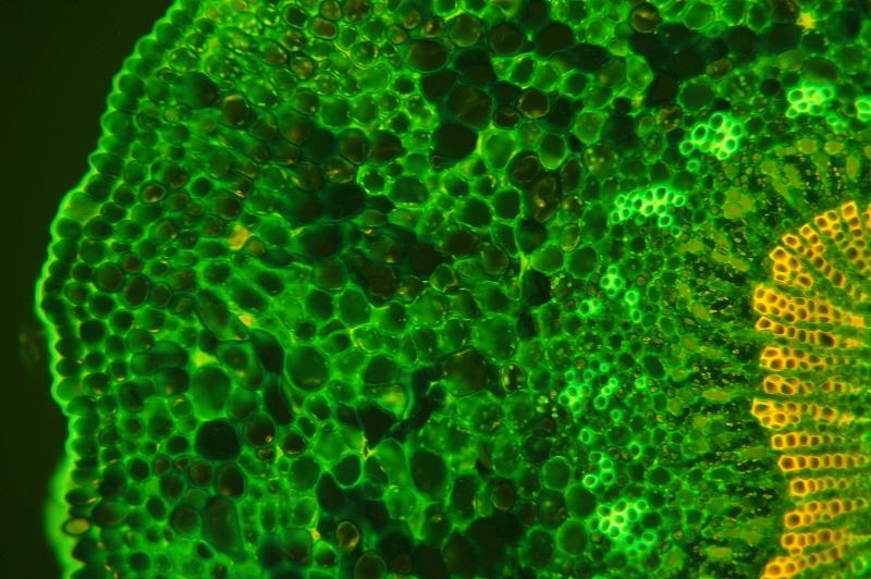 In botanischen Schnitten ist der Gefäßbündelverlauf im polarisierten Licht sehr eindrucksvoll zu sehen. Besonders die Xylem-Elemente erscheinen leuchtend hell, während die übrigen Gewebe dunkel sind.