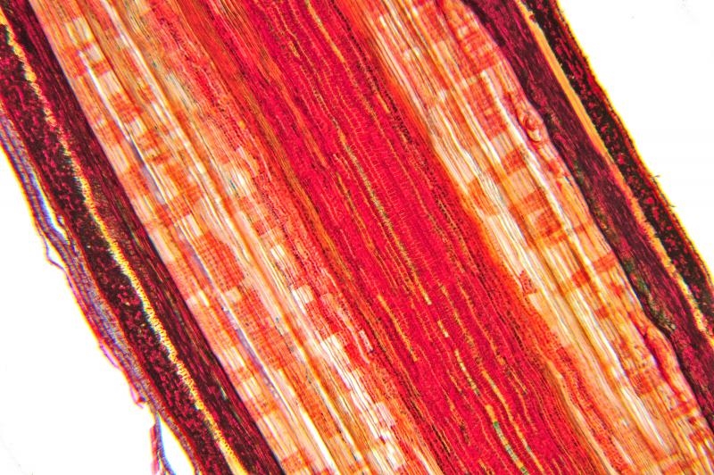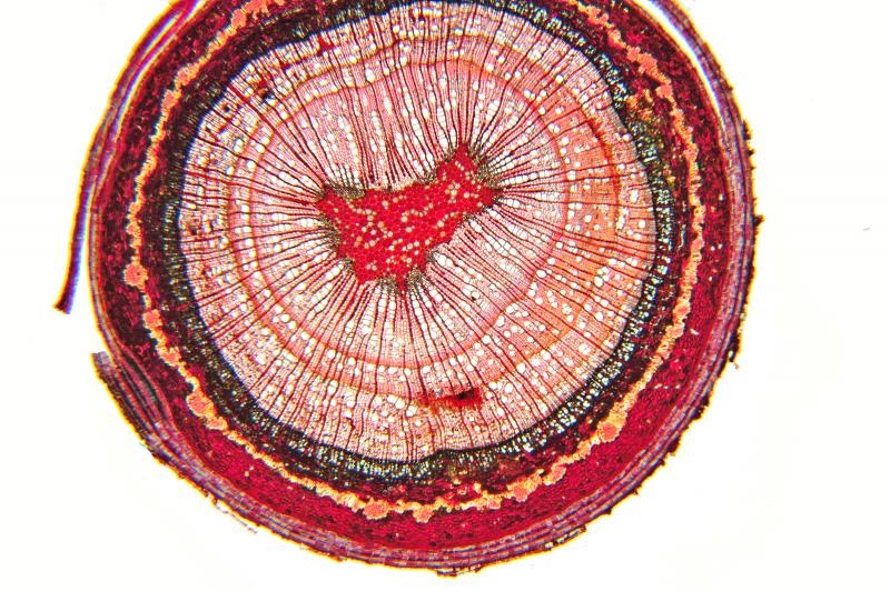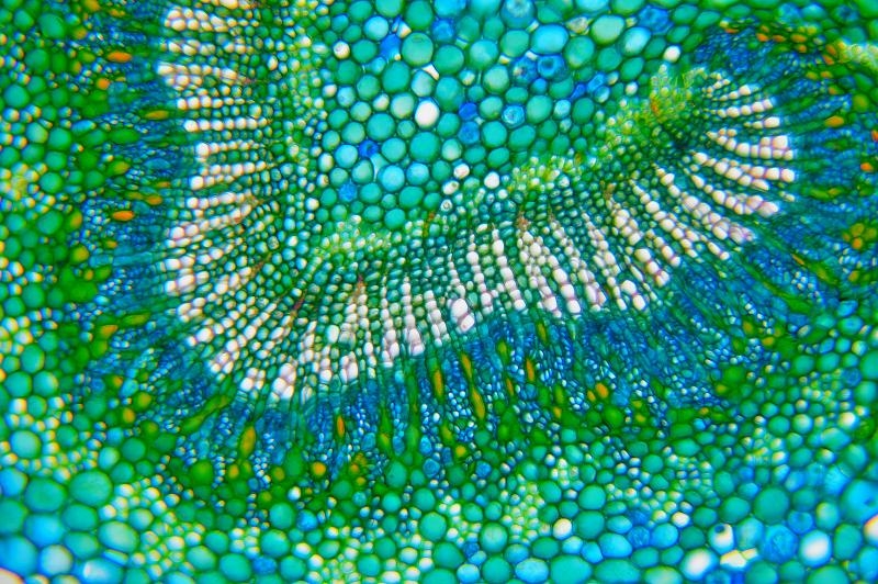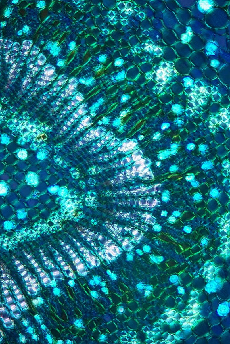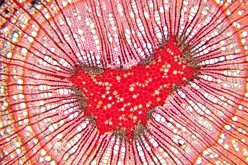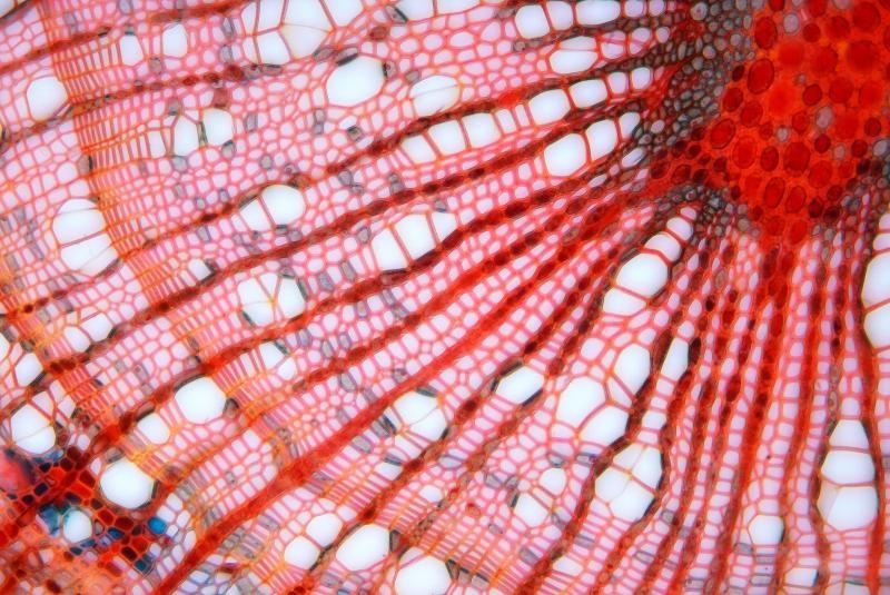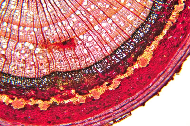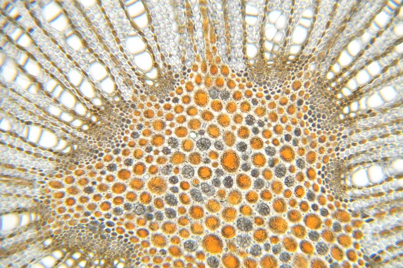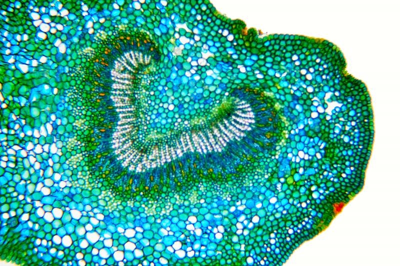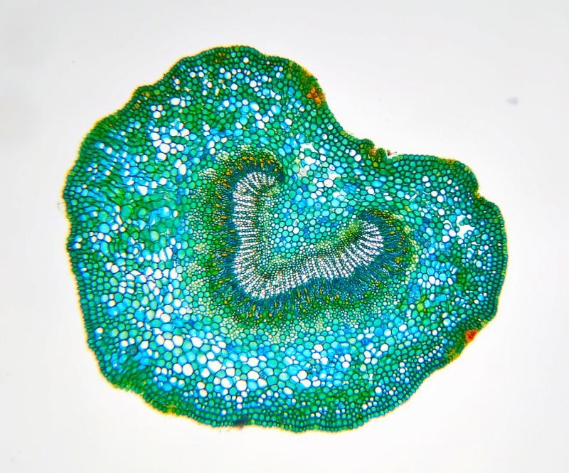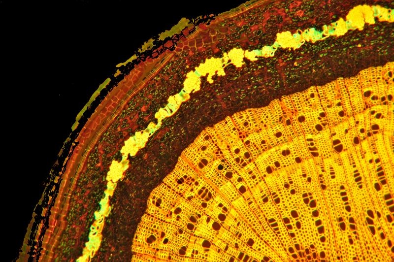 In botanischen Schnitten ist der Gefäßbündelverlauf im polarisierten Licht sehr eindrucksvoll zu sehen. Besonders die Xylem-Elemente erscheinen leuchtend hell, während die übrigen Gewebe dunkel sind.