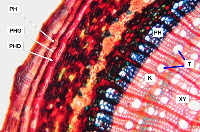 CU = Cuticula, EP = Epidermis, RP = Rindenparenchym, SK = Sklerenchym, PZ = parenchymatische Zellen, PH = Phloem, K = Kambium, XY = Xylem, T = Trachee, PMS = primärer Markstrahl