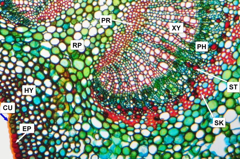 CU = Cuticula, EP = Epidermis, RP = Rindenparenchym, HY = Hypodermis, RP = Rindenparenchym, XY = Xylem, PH = Phloem, SK = Sklerenchym, ST = Strahlenparenchym
