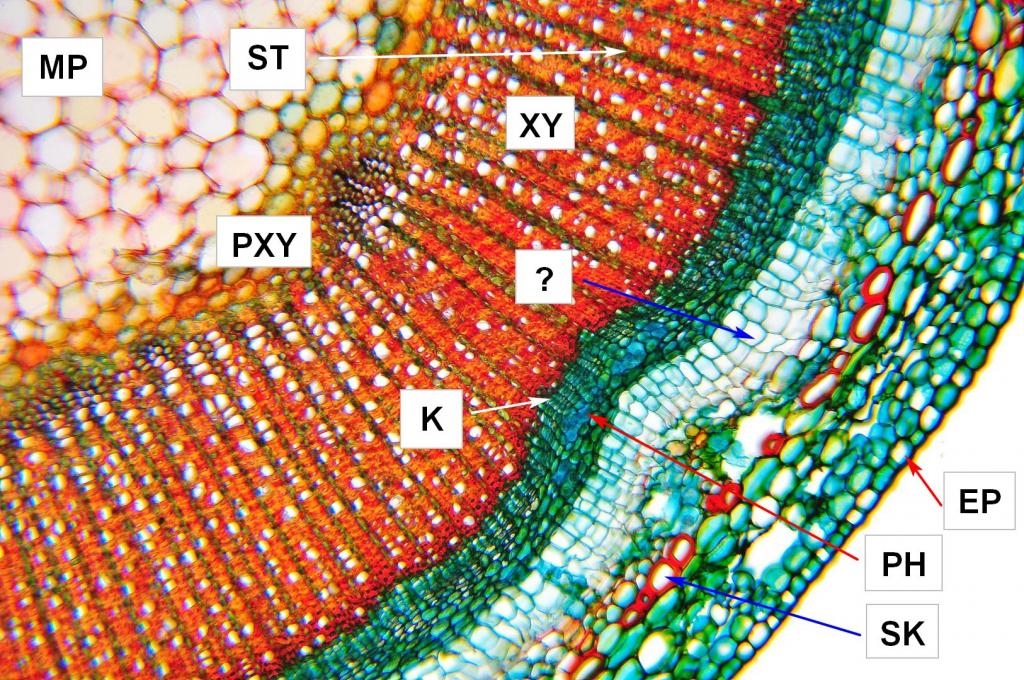 MP = Markparenchym, PXY = Protoxylem, ST = Strahl, K = Kambium, ? = Phellem, XY = Xylem, SK = Sklerenchym, PH = Phloem, EP = Epidermis
