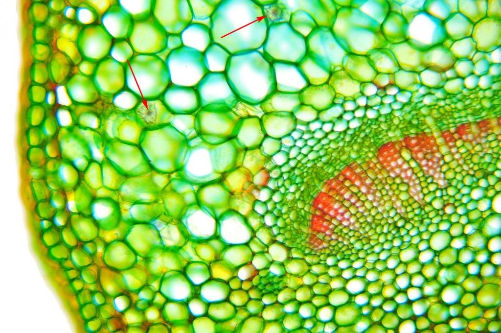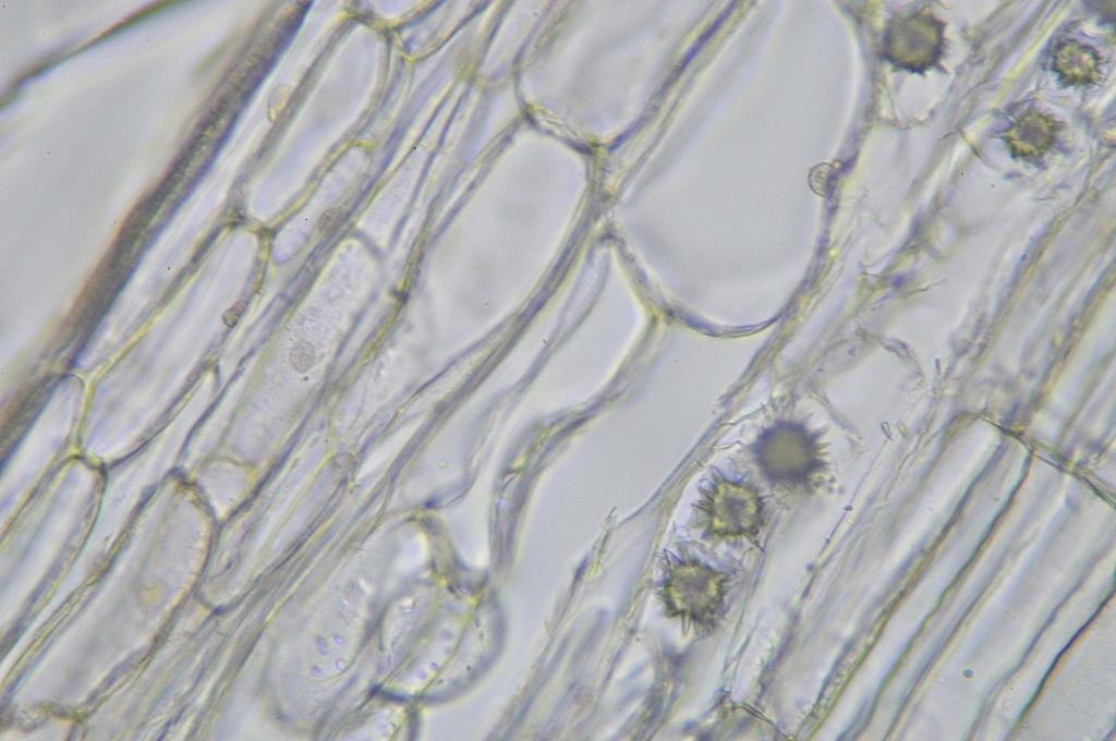 In den parenchymatischen Zellen von der Koreanischen Abelie sind besonders schön ausgebildete, scharfkantige, morgensternähnliche Kristalldrusen (Calciumoxalat Kristalle) zu sehen.