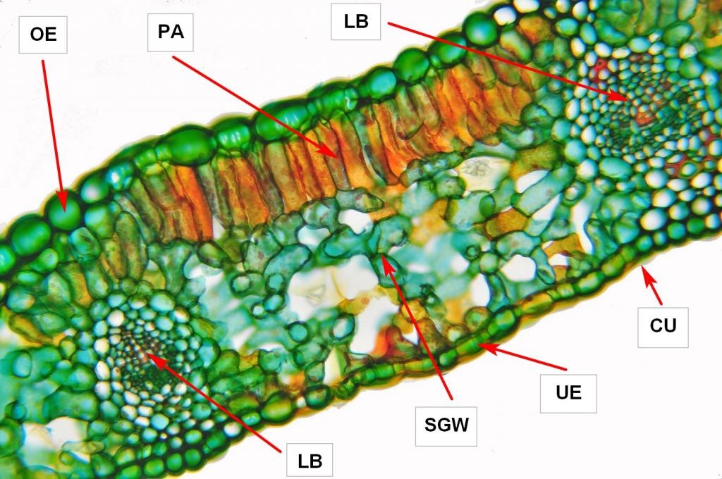 OE = obere Epidermis, PA = Palisaden-Gewebe, LB = Leitbündel, SGW = Schwammgewebe, UE = untere Epidermis mit Schließzellen, CU = Cuticula