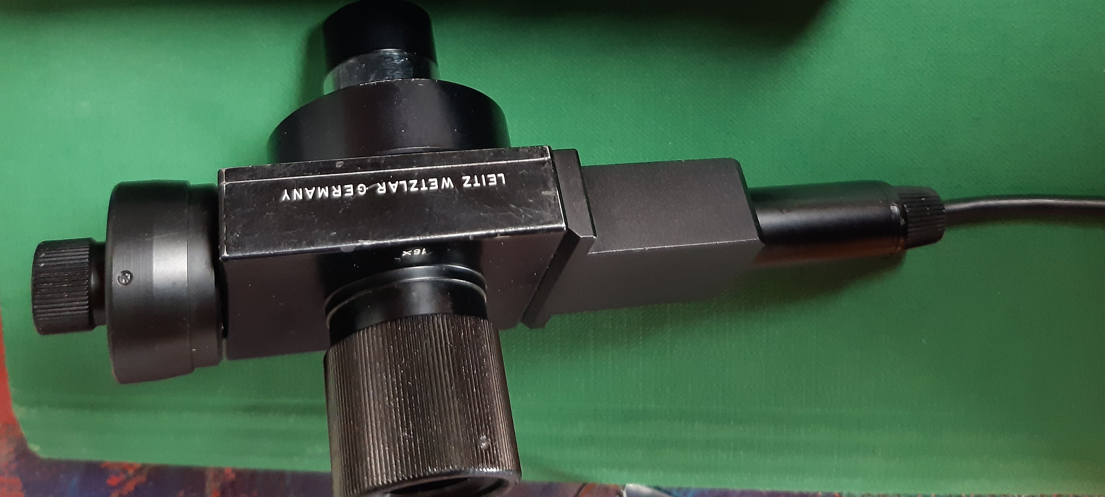 dieses Meßokular von Leitz (mit Skala, siehe Bild !) gehört zum Mehrzweckmeßmikroskop CMM, zusammen mit einem zugehörigen "normalen" Zwillingsokular, an Binokulartuben. Es konnte auch an normalen Mikroskopen verwendet werden, falls genaue Messungen erforderlich waren.