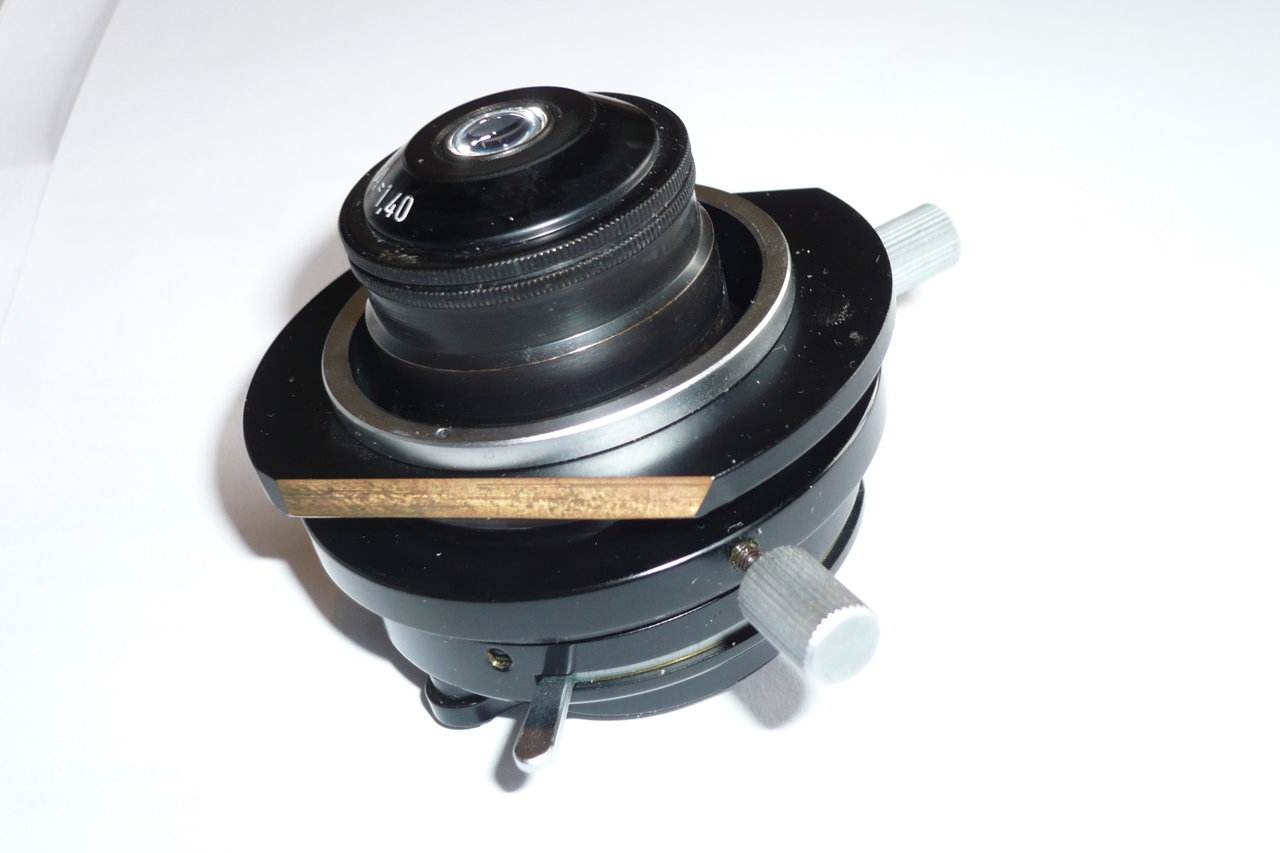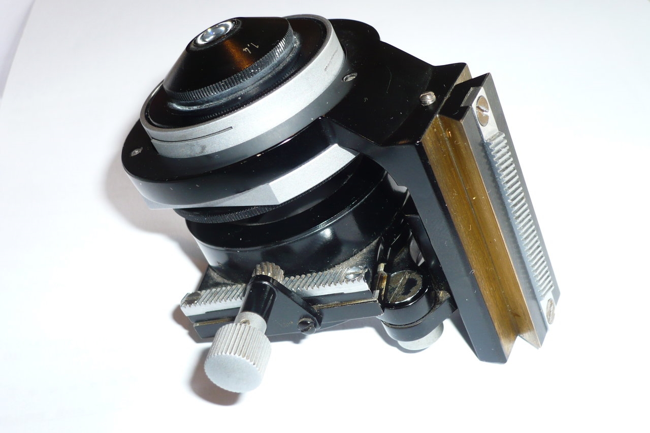 Der erste Kondensor passt exakt in den Kondensorhalter meines Ortholux 1. Er hat mit A = 1,4 eine deutlich höhere Apertur als mein ,,Badewannen-Kondensor" mit dem  A = 1,25 kippbaren Kondensor-Kopf.  Mit ihm habe ich bereits erfolgreich am Ortholux gearbeitet.