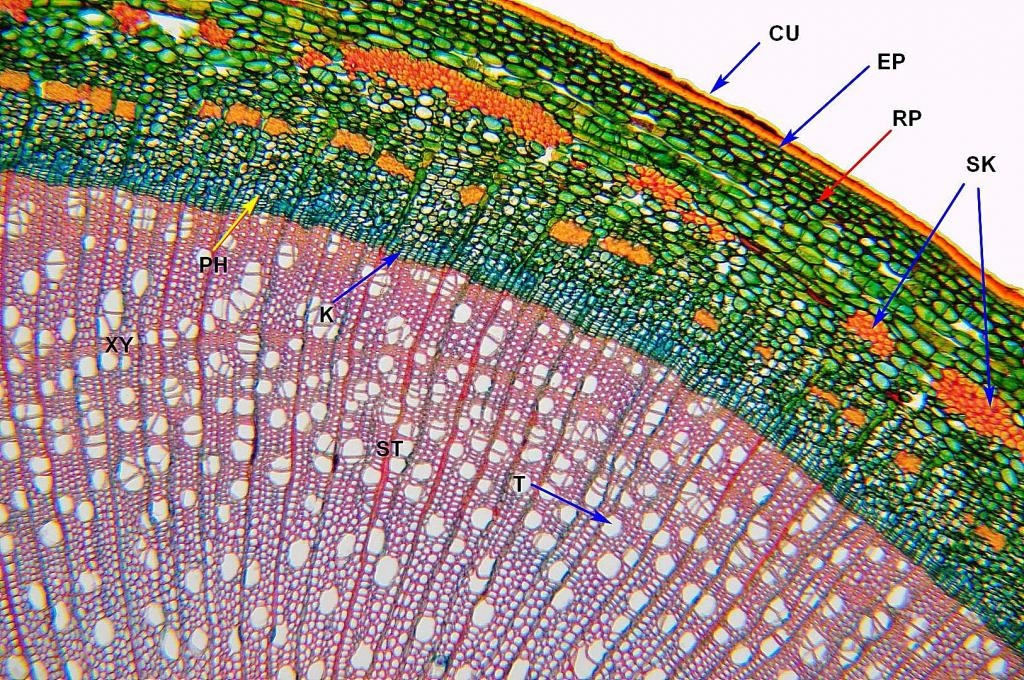 CU = Cuticula, EP = Epidermis, RP = Rindenparenchym, SK = Sklerenchym, XY = Xylem, PH = Phloem, K = Kambium, ST = Strahl, T = Trachee