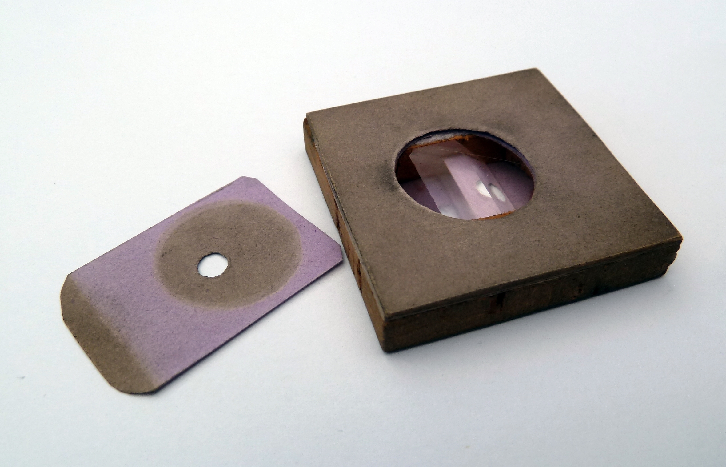 Das linke Präparat hat auf der Rückseite noch eine verschiebbare Pappblende, damit man den Strahl sauber begrenzen kann und somit die Erscheinung besser sieht: