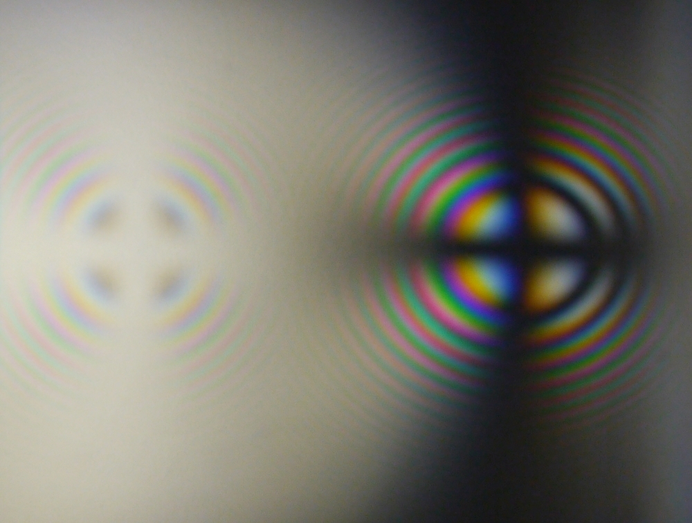 Natürlich habe ich auch versucht das Phänomen selbst am Mikroskop zu fotografieren und festgestellt, dass dies gar nicht so einfach gelingt. Mein bestes Ergebnis am Präparat mit dem Prisma ist hier zu sehen: