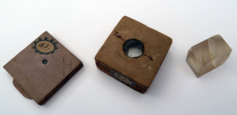Dies sind meine Präparate, die aus der Zeit vor 1900 stammen, die beiden rechten entsprechen dem Aufbau mit einem "Synthetischen Zwilling", das linke dem Parallelepiped: