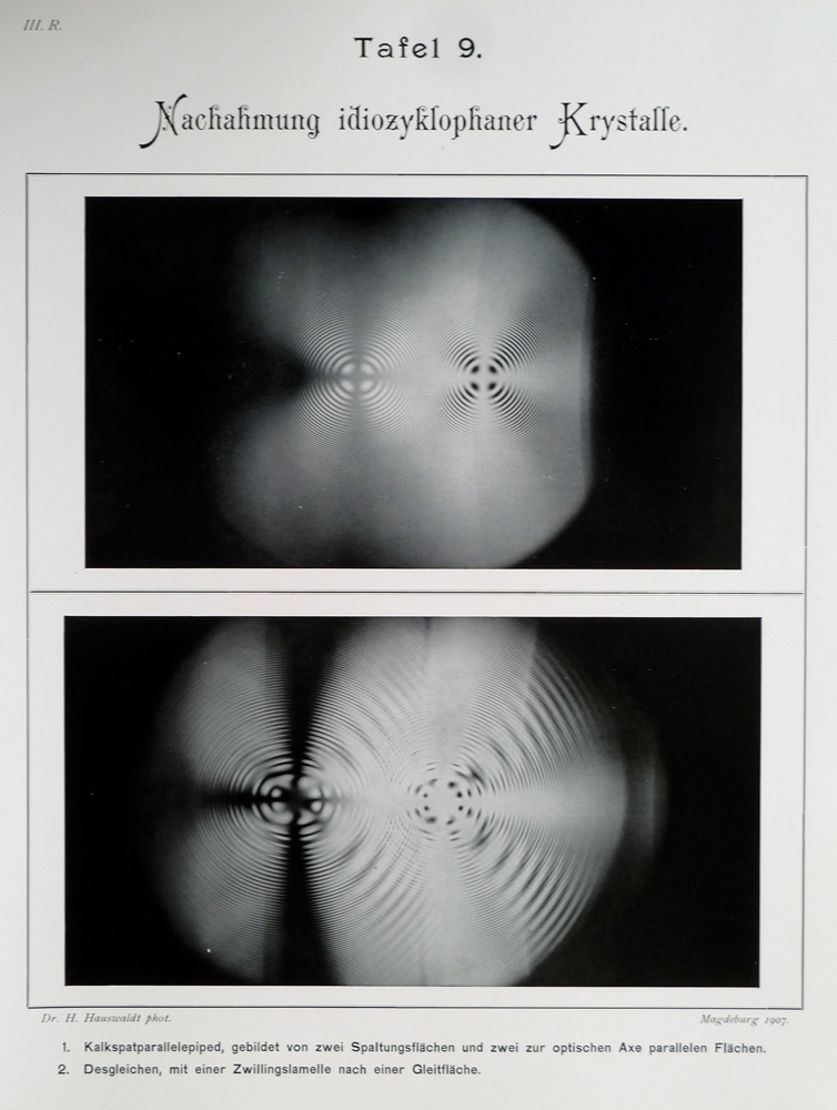 Idiocyclophane Kristalle zeigen beim Durchsehen im natürlichen Licht, also ohne jegliche Polarisatoren, bereits zwei Achsenbilder nebeneinander, eines, das dem mit gekreuzten Polarisatoren entspricht, und direkt daneben eines, das dem mit parallelen Polarisatoren entspricht. Bereits der Großmeister der Fotografie von Interferenzfiguren, Hans Hauswaldt (siehe hier) , hat diese Eigenschaft abgebildet. Dies ist seine hochqualitative S/W-Abbildung aus dem Jahre 1907: