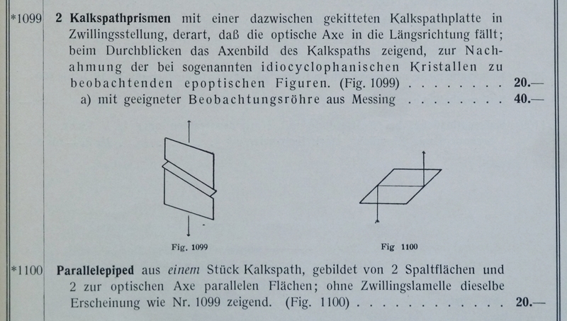 In der Blütezeit der Kristalloptik vor mehr als 100 Jahren wurden auch Demonstrationspräparate für idiocyclophane Kristalle hergestellt, und in meiner Sammlung befinden sich glücklicherweise gleich drei davon deren Funktion auf zwei unterschiedlichen Methoden beruhen. Der Aufbau geht am besten aus der Preisliste von der Fa. Dr. Steeg & Reuter aus dem Jahre 1910 hervor: