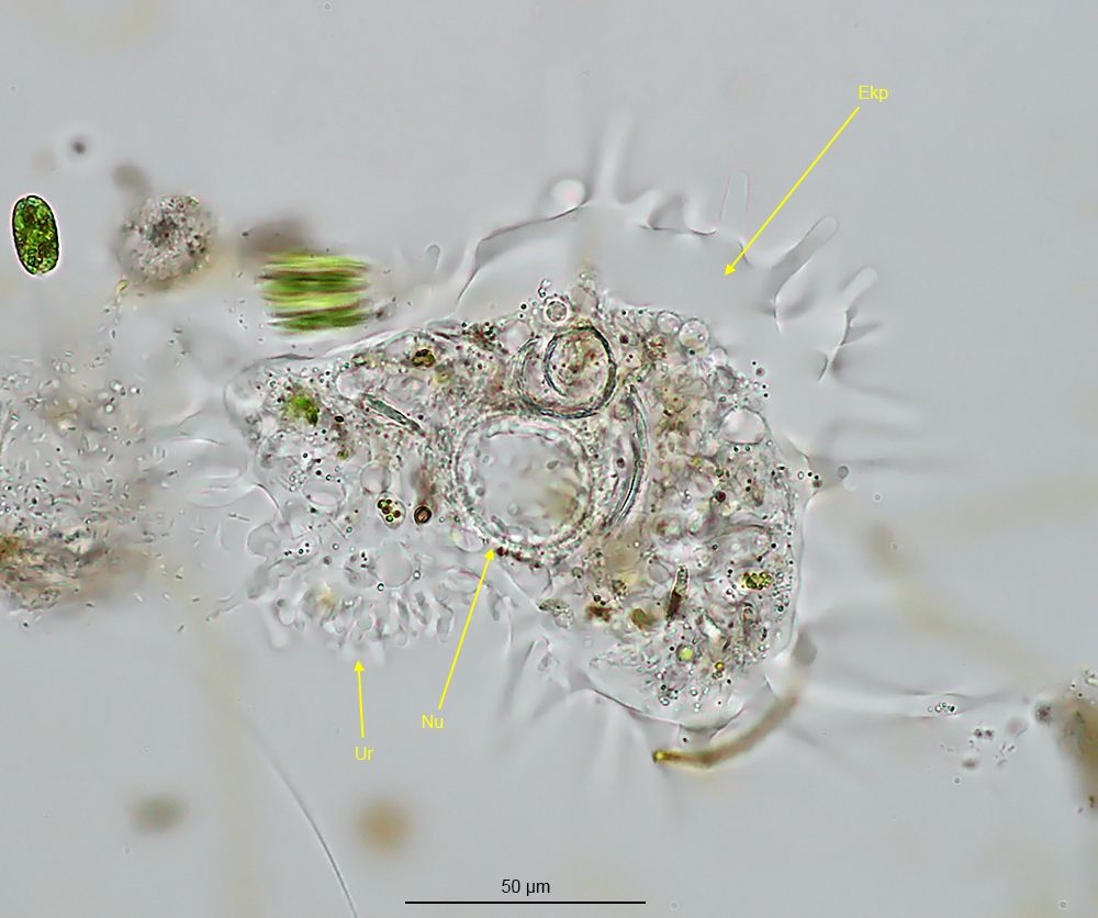 Selbst um ungefärbte, typische Phasenobjekte muss man als Hellfeldmikroskopiker keinen großen Bogen machen, wie diese Beispiele einer Dinamoeba mirabilis zeigen. Die beiden unteren Bilder dokumentieren ungefärbte, lebende Bakterien um den Kern dieser Amöbe; einmal in Aufsicht und einmal im optischen Schnitt als kreisförmige Anschnitte – dicht an dicht, wie bei einem Palisadenzaun, dem Zellkern der Amöbe anliegend. Das verwendete Objektiv war ein schlichter Olympus-Achromat 100:1 (Ekp=Ektoplasma, Nu=Nukleus, Ur=Uroid, Ba=Bakterien, Nk=Nukleolarsubstanz):