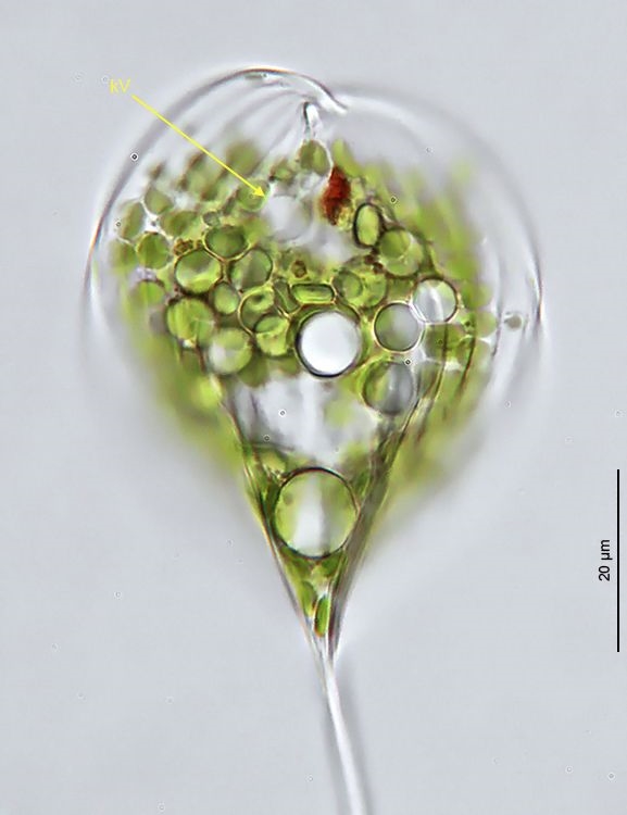Trachelomonas spec., die derbe Zellhülle ist teilweise geborsten, so dass der Protoplast mit Chloroplasten und Paramylonkörnern hervortritt - ein interessantes Fragment: