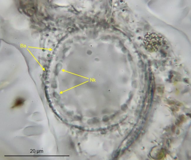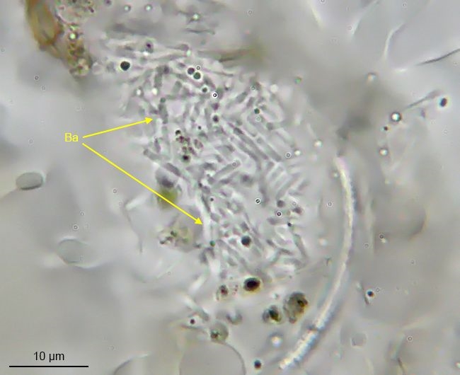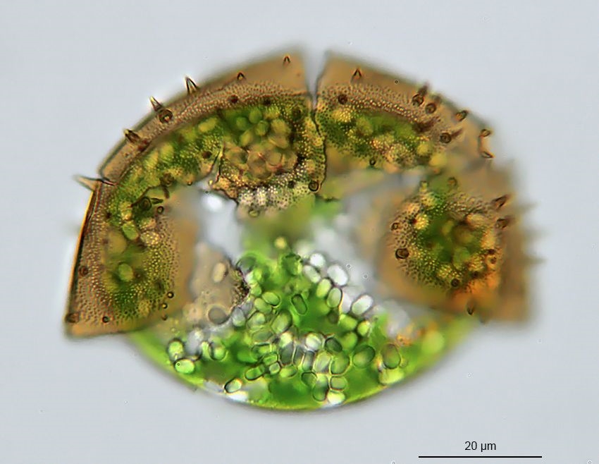 Im Folgenden stelle ich einige unlängst aufgenommene Objekte aus einem einzigen Präparat vor – die Proben stammen von Martin Kreutz, bei dem ich mich herzlich bedanke. Die verwendete Ausrüstung ist vergleichsweise schlicht: Olympus BH-2/BHT (160mm-System) mit 6V 20W Halogenleuchte, Splan 40/0,70 und A 100/1,30 Öl, Kondensor N.A. 1,4, reines Hellfeld, Projektiv NFK 1,67x (der einzige Luxus) und Canon EOS 700D.