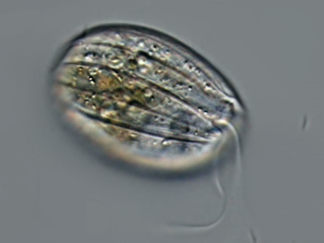 Die Pellikula weist insgesamt 12 Streifen auf. Weiterhin sind die zwei etwa gleich langen Flagellen zu sehen: