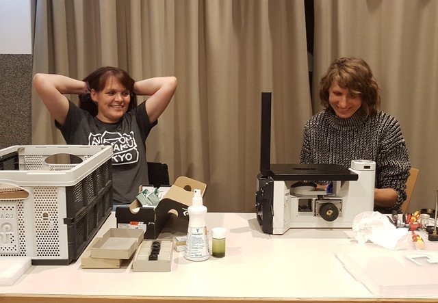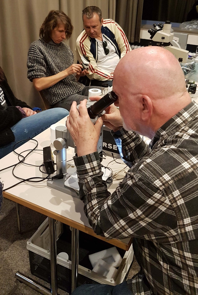 Zuschauerrunde bei der "Live-Reparatur" eines Mikroskops durch Diana