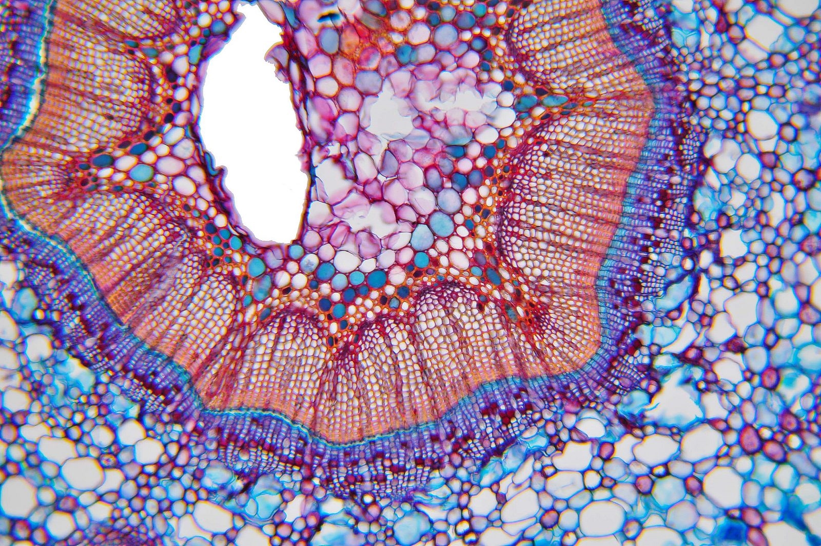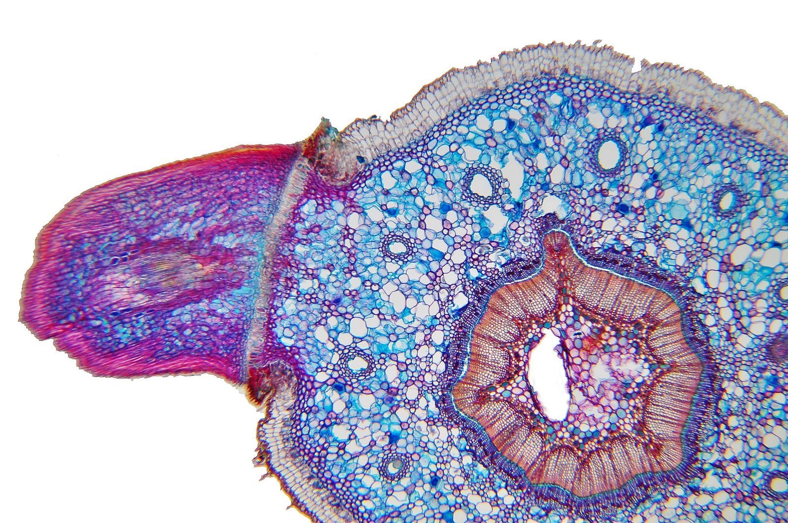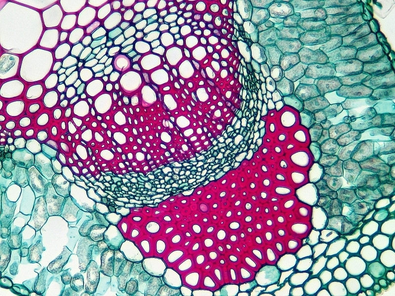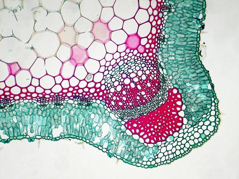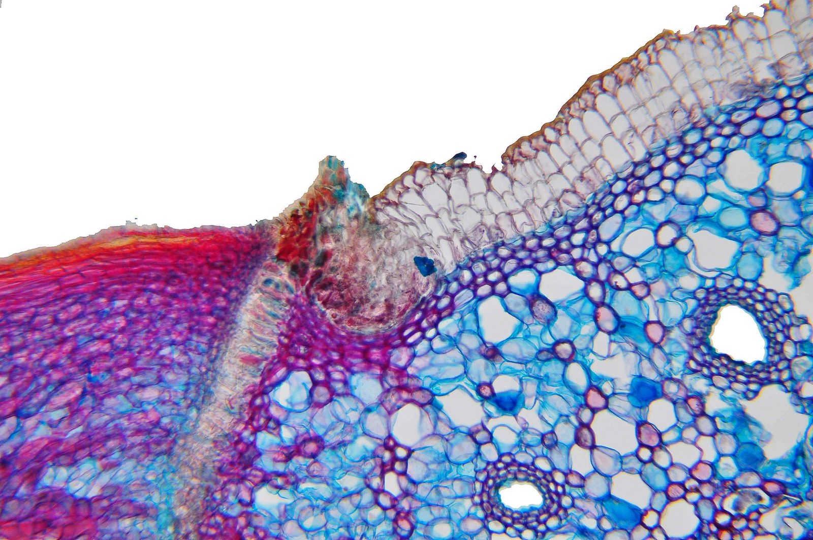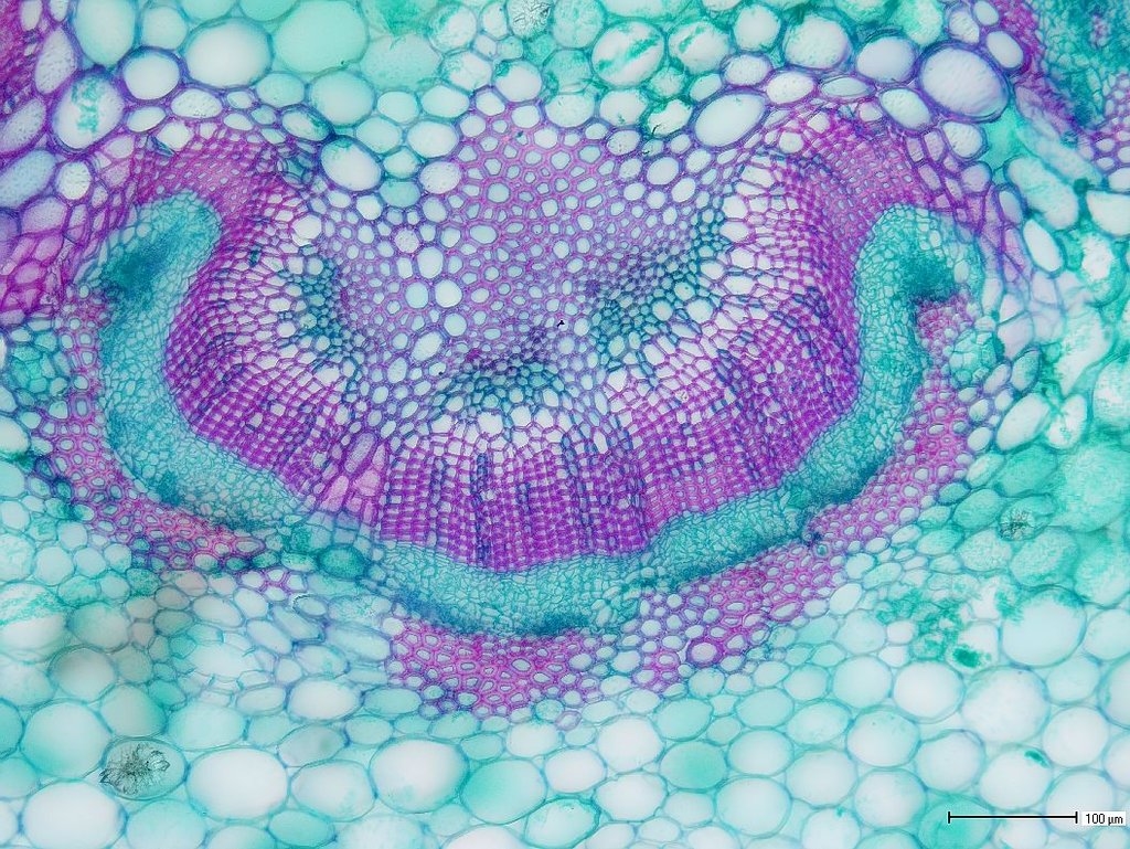 die Wiesen-Platterbse Lathyrus pratensis wurde mit W-3A-Färbung nach Wacker (Acridinrot-Acriflavin-Astrablau) gefärbt.