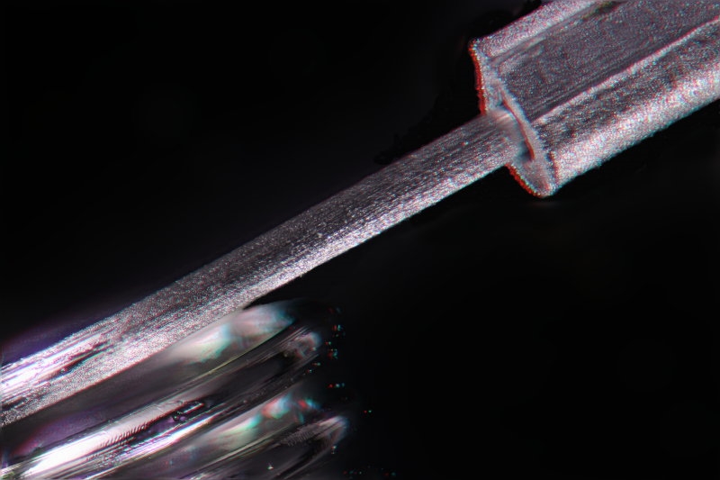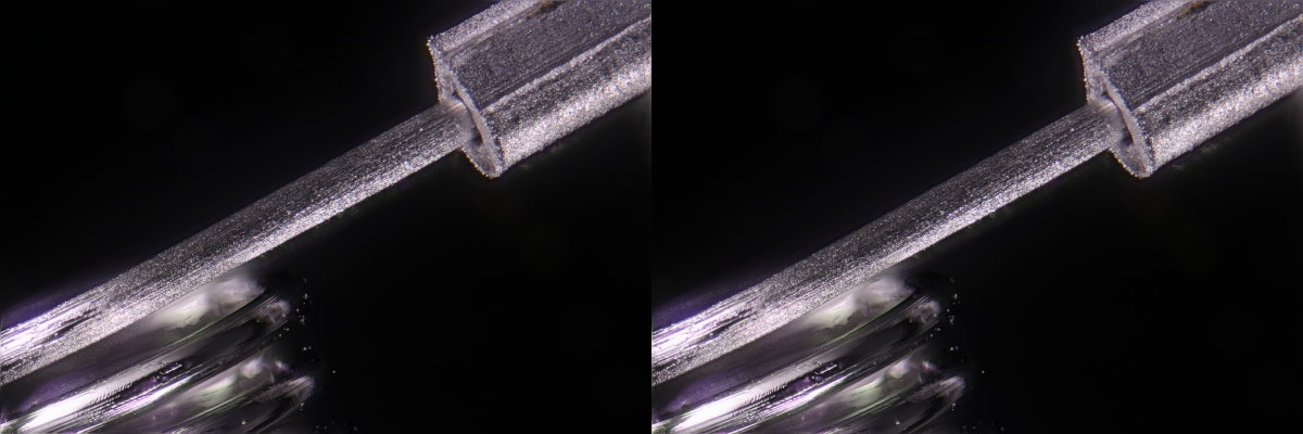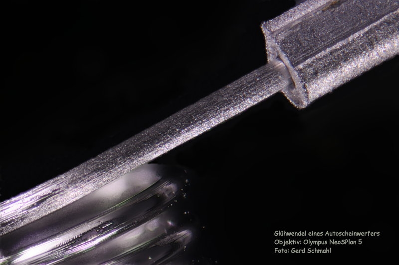 ich wärme diesen alten Faden mal wieder auf, weil ich heute nochmal eine schöne Glühwendel aus einem Autoscheinwerfer fotografiert habe. Dabei fand ich die Stelle besonders spannend, an der der eigentliche Glühfaden an der Zuleitung befestigt ist: