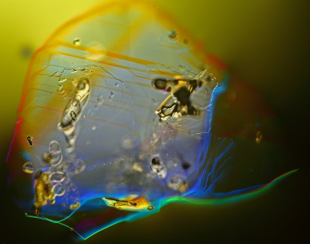 diese herrlichen Farben entstehen durch Dispersion an den Grenzflächen zwischen Kristall und Immersion. Sie setzen einen sehr guten "Match" zwischen dem Brechungsindex der Immersion und dem Festkörper vorraus, d.h. die Dispersiionskurven von Flüssigkeit und Festkörper, die einen sehr unterschiedlichen Anstieg haben, müssen sich im Bereich des sichtbaren Sprktrums schneiden. Wenn man dann die Apertur sehr einengt, enstehen diese psychedelischen Effekte. Im wissenschaftlichen Sprachgebrauch wird dieses Verfahren als "Dispersion Staining" bezeichnet und für genaue Bestimmungen der optischen Daten verwendet. Insofern ist dieses Bild gar nicht sinnfrei!
